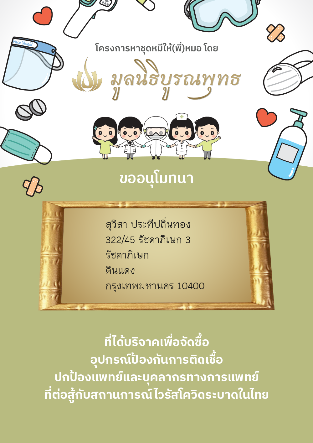 นางวรรณวิมล ทิศา นส.พิณท์สินี ทิศา (บริจาค โครงการ ส่งแมสก์ดีให้(พี่)หมอ) | 490.00 บาท | ภาพที่ระลึก |