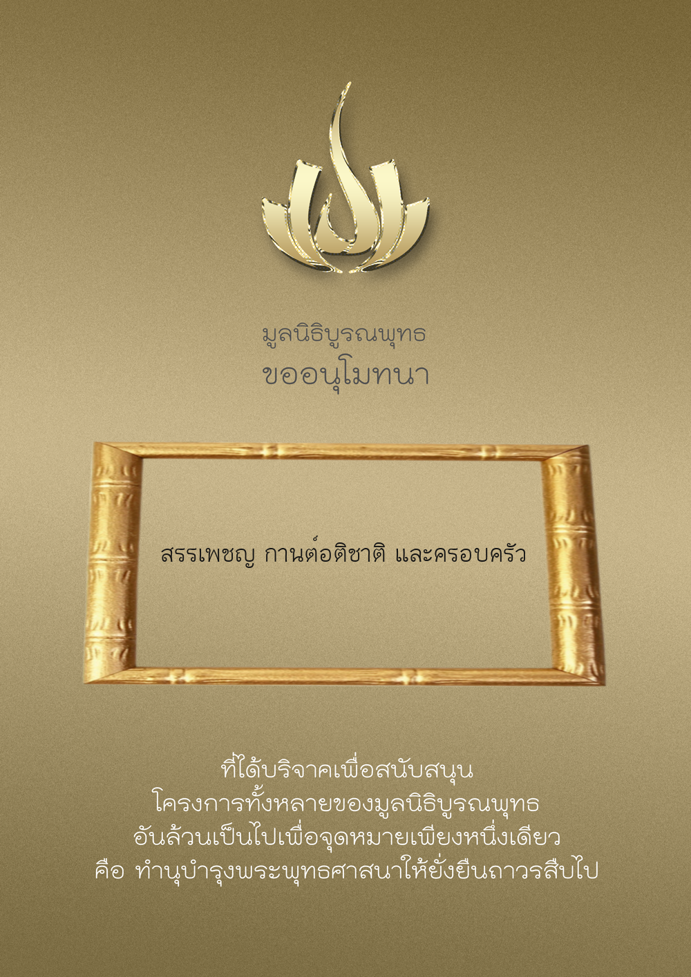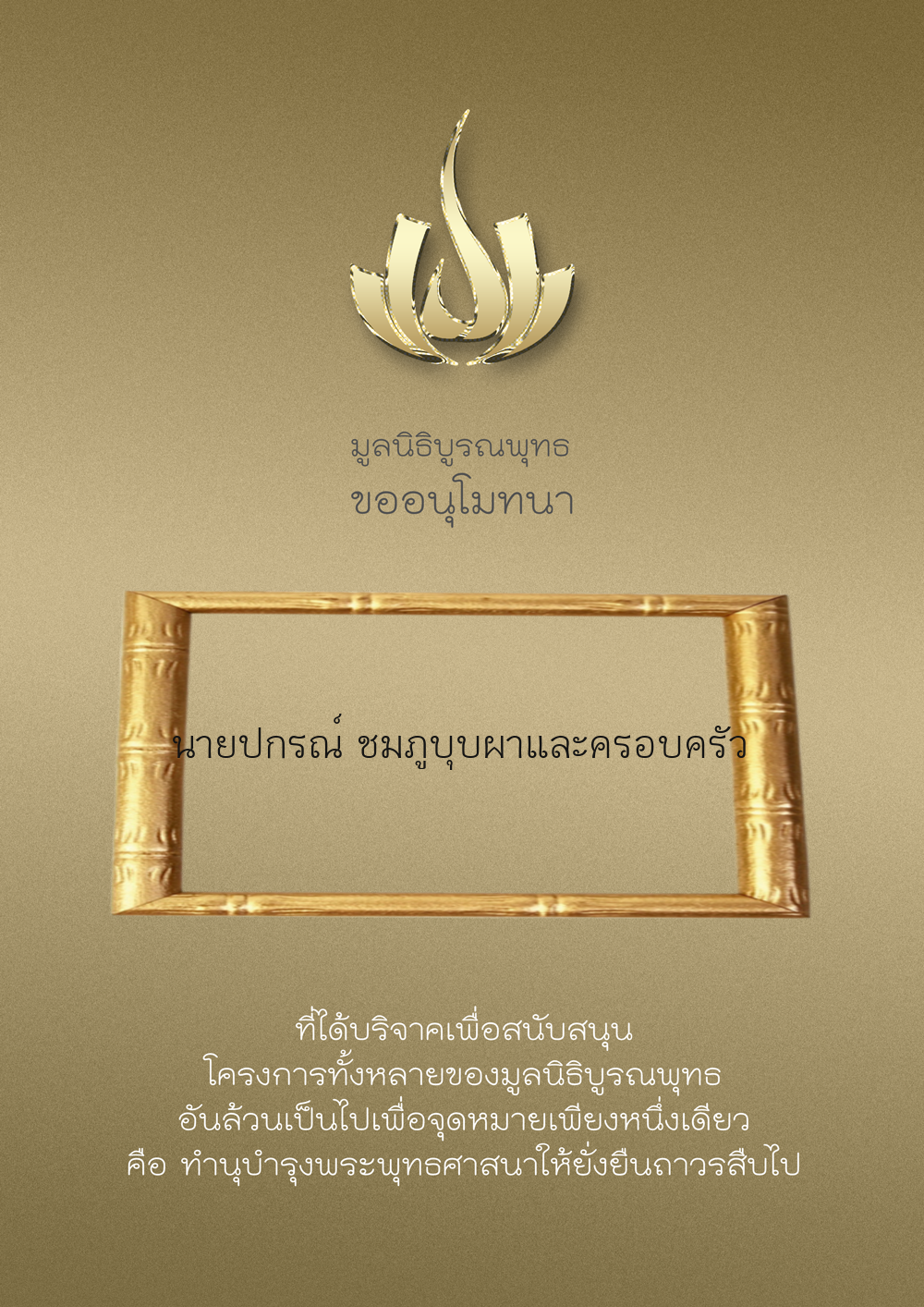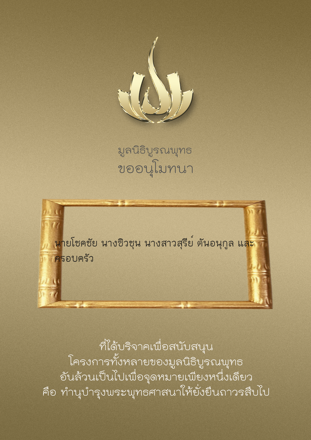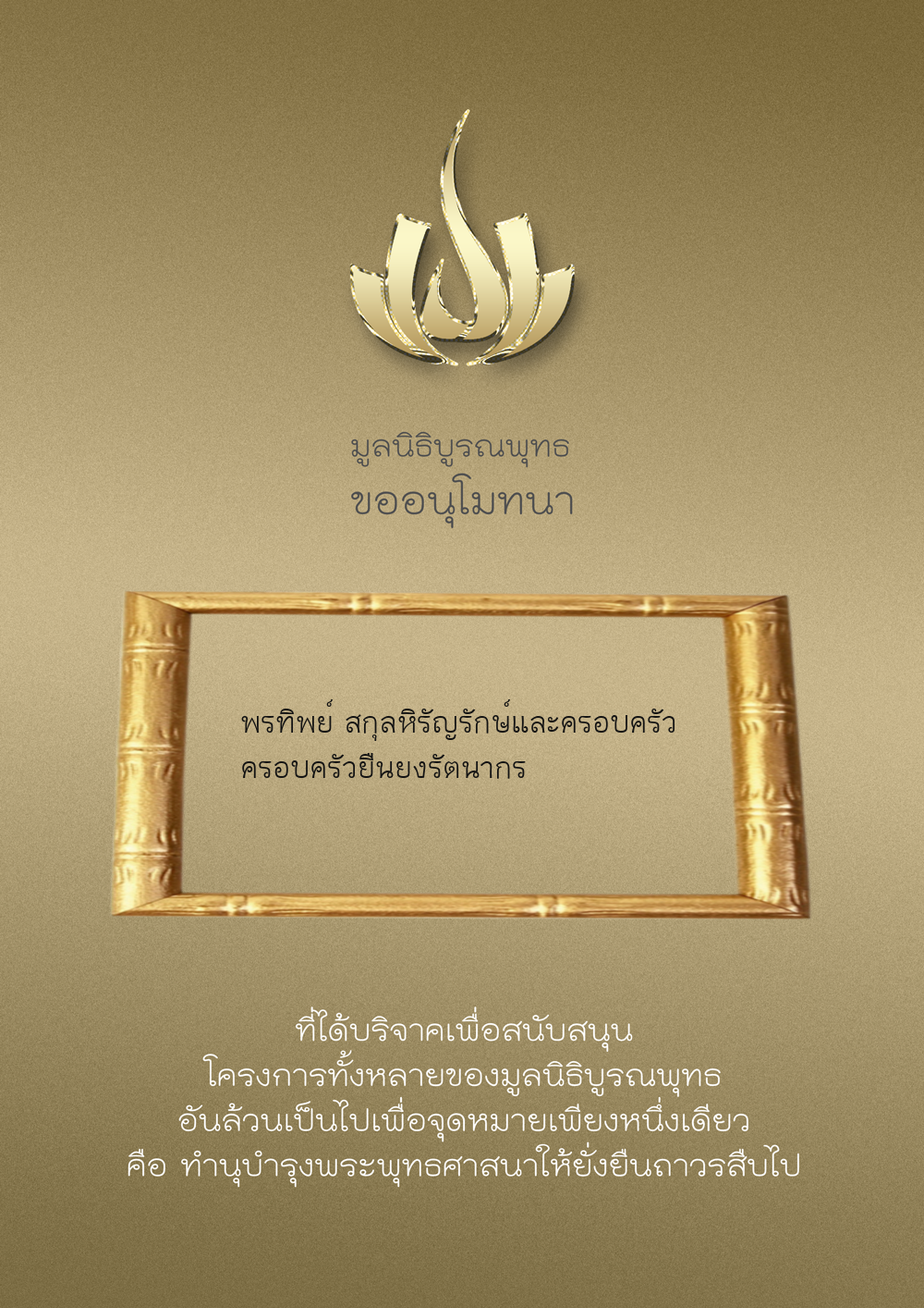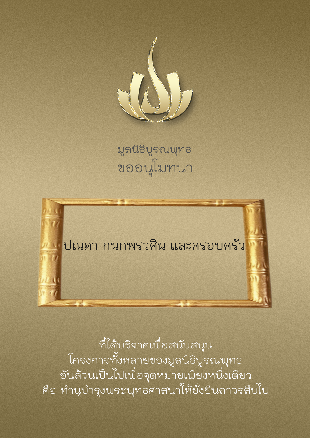 | ลำดับที่ 9949 | ณัฐพร ขันทเขตต์ และ ครอบครัว | 10,000.00 บาท | ภาพที่ระลึก |