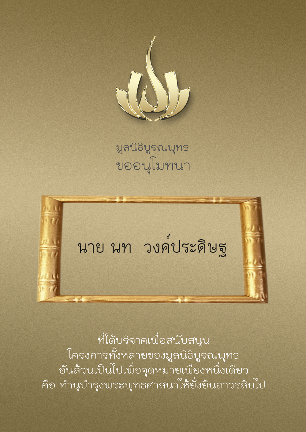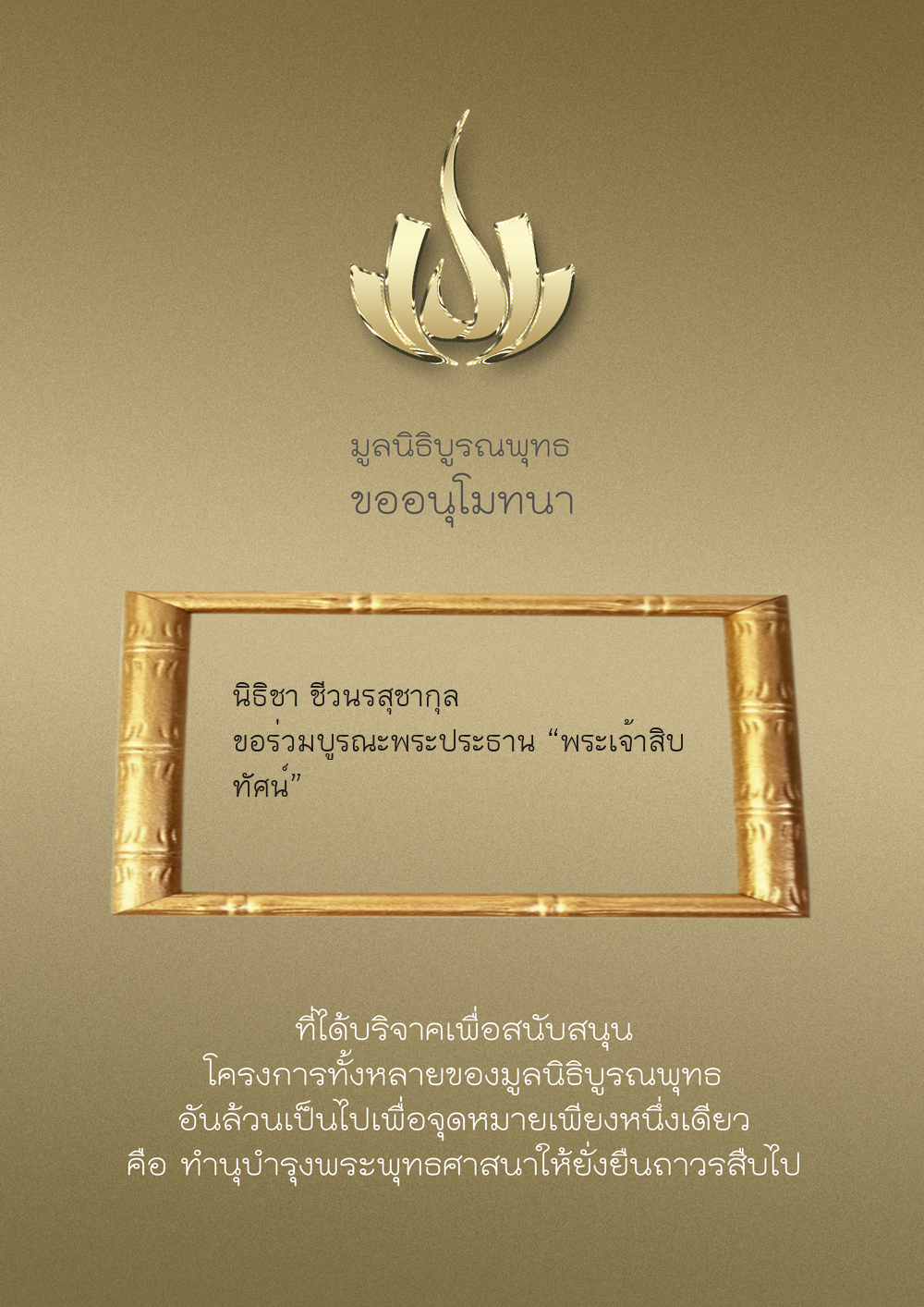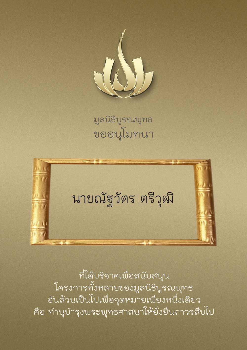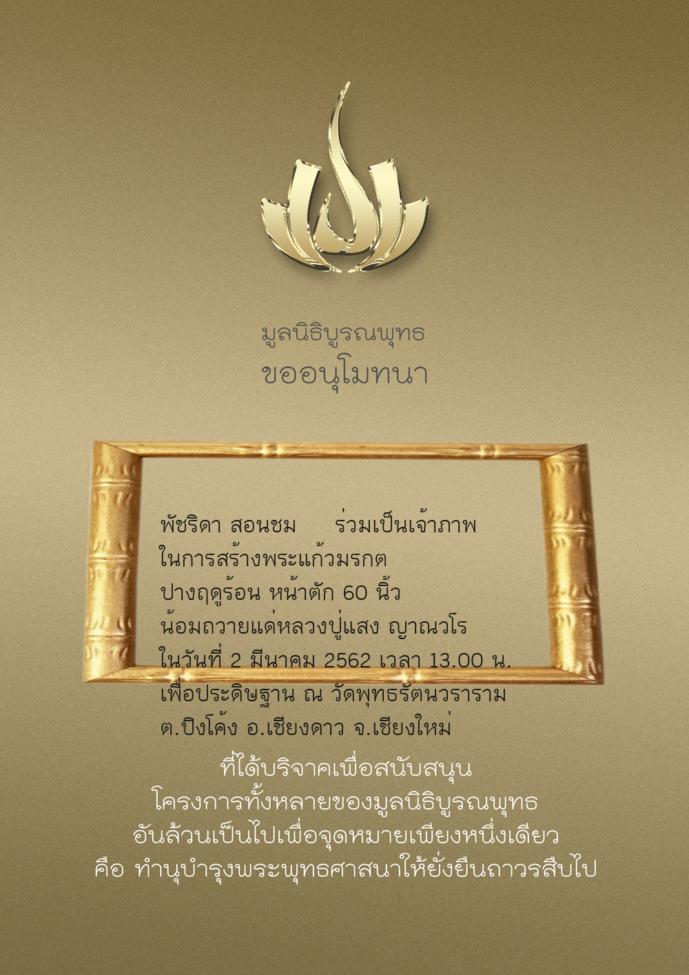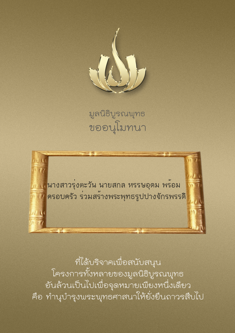 | ลำดับที่ 34 | ร่วมบริจาคสร้างวัดบูรณพุทธ | 3,000.00 บาท | ภาพที่ระลึก |