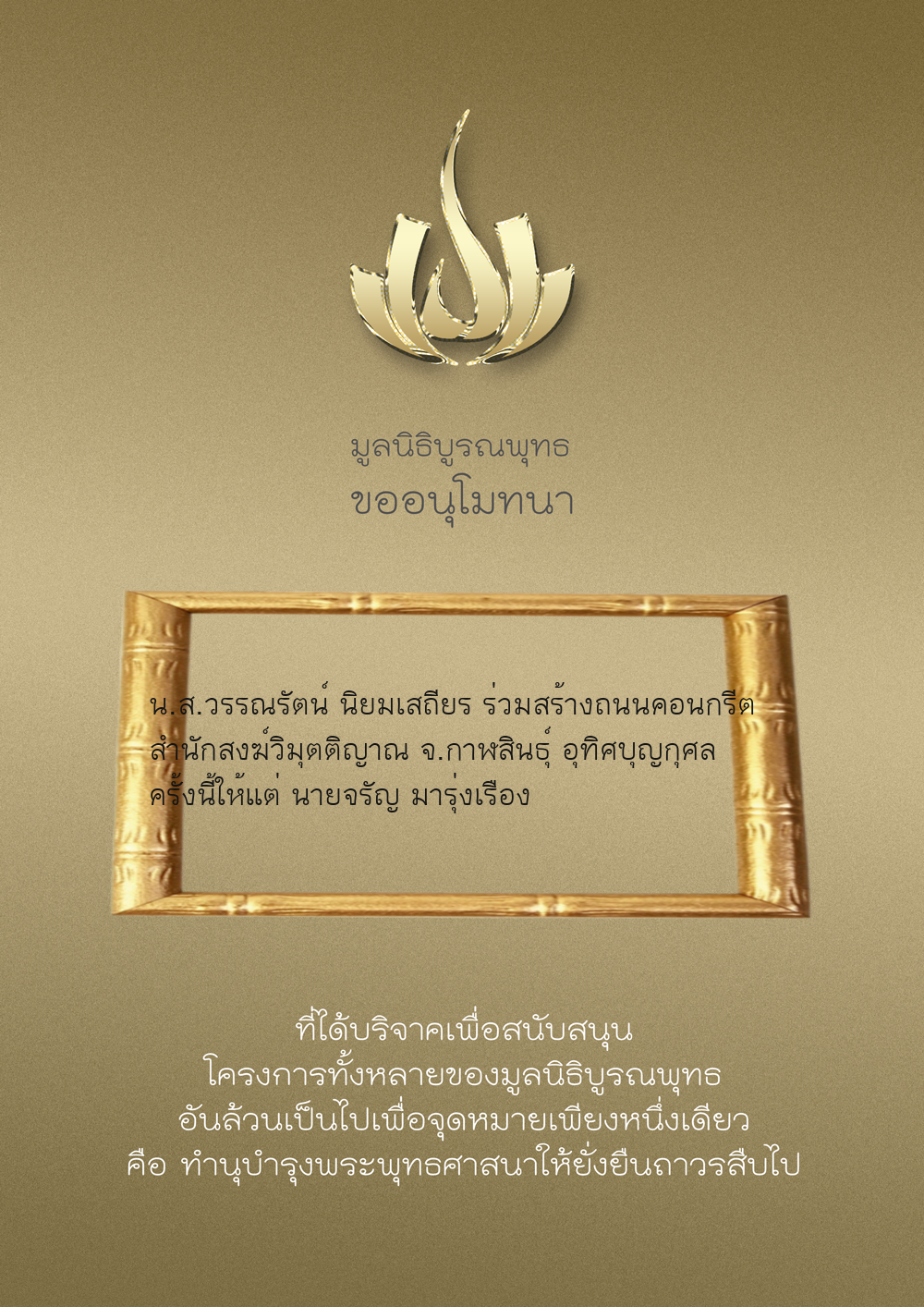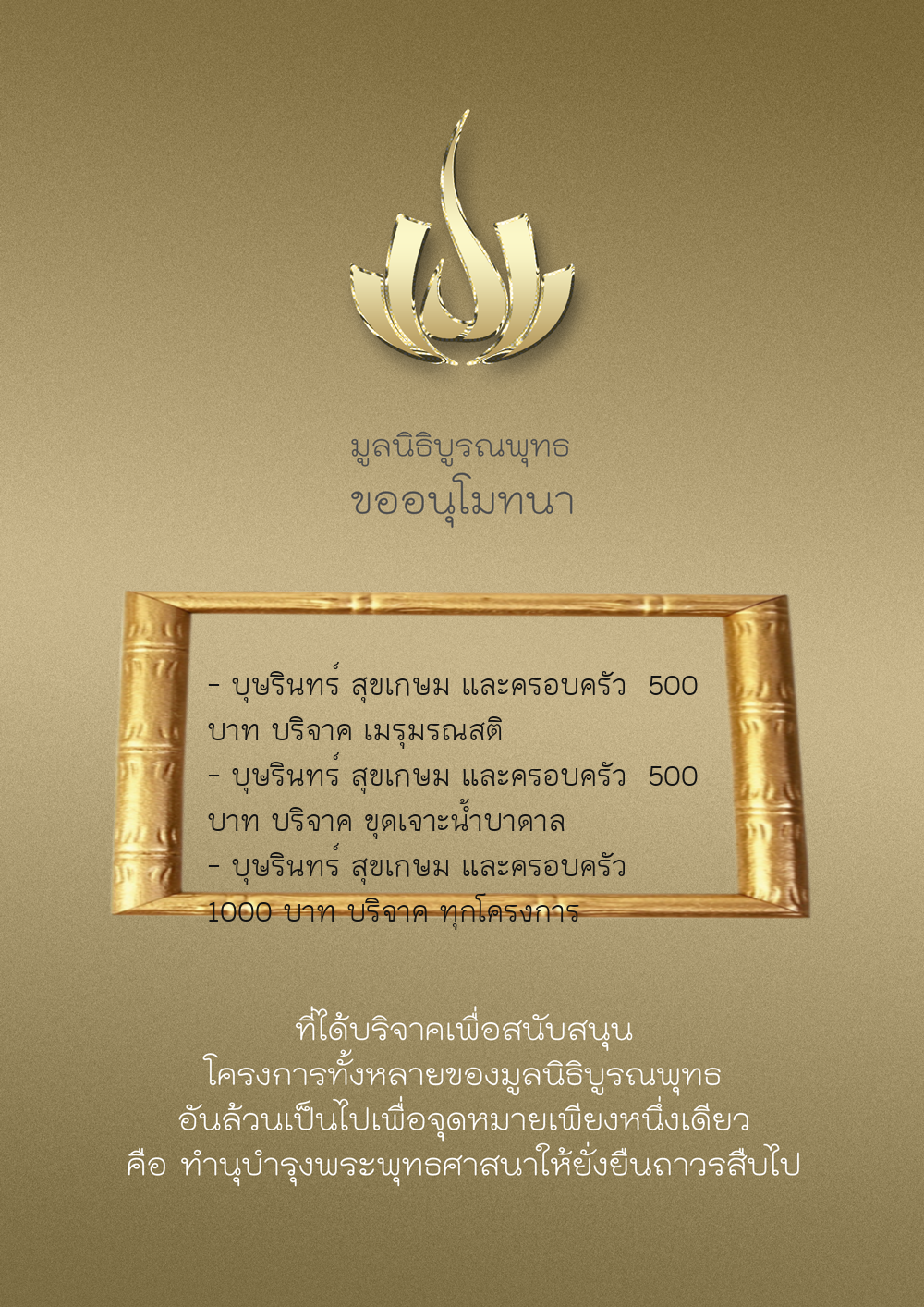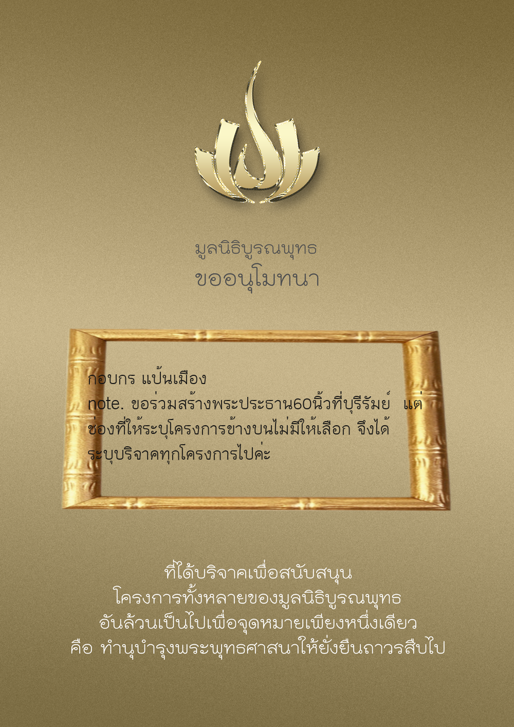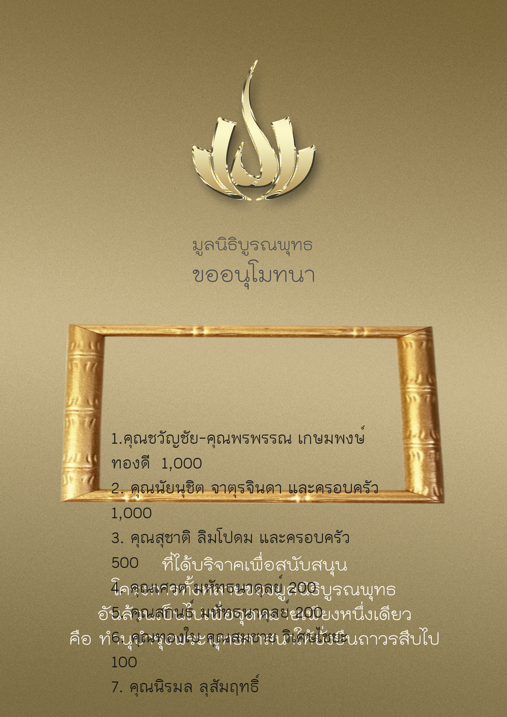 | ลำดับที่ 9999 | เพ็ญอนงค์ มโนวร | 500.00 บาท | ภาพที่ระลึก |