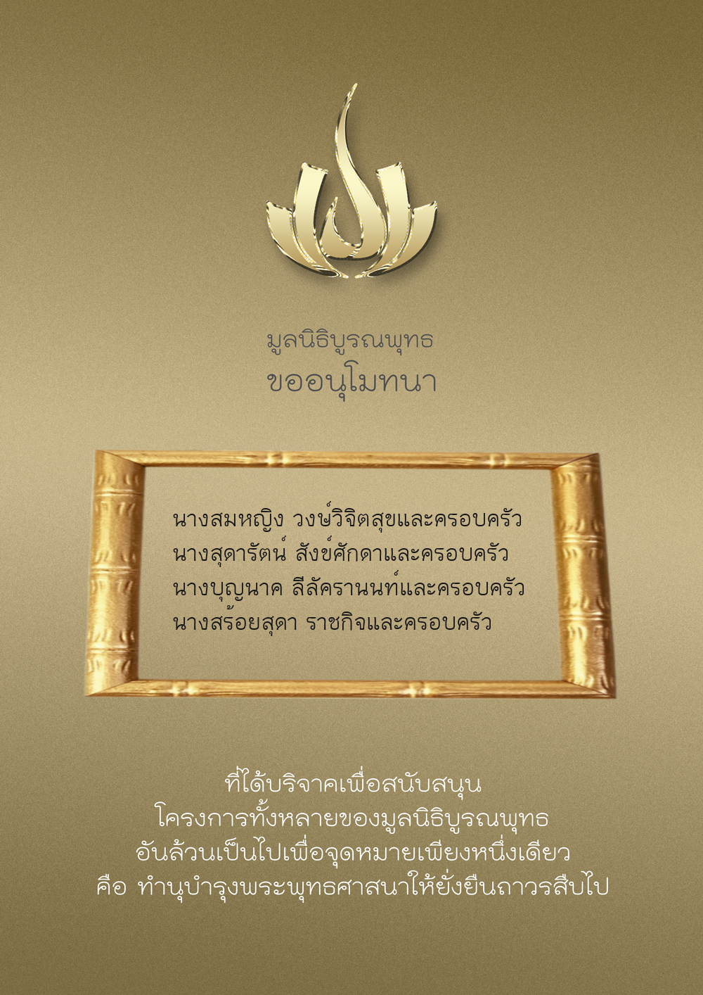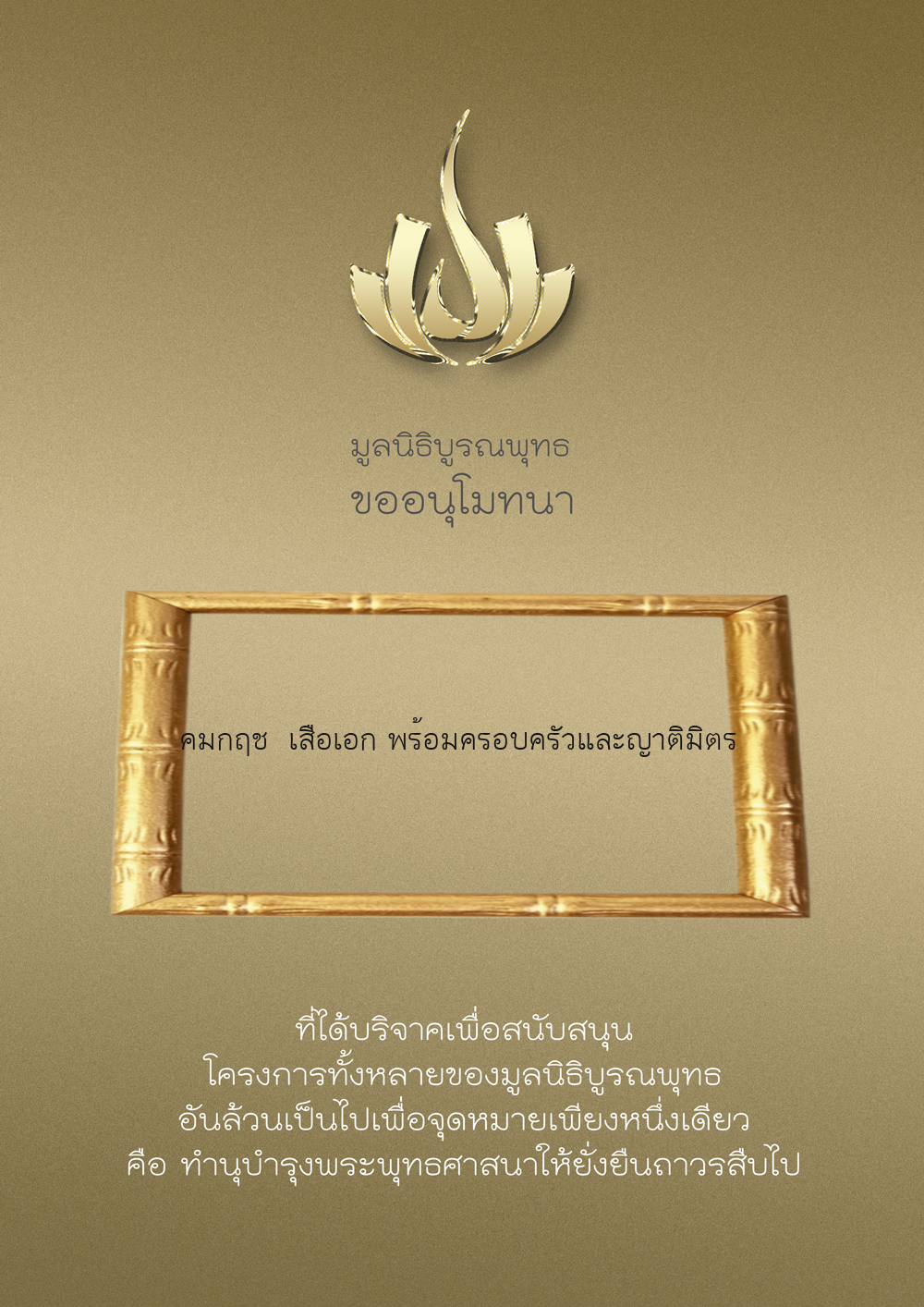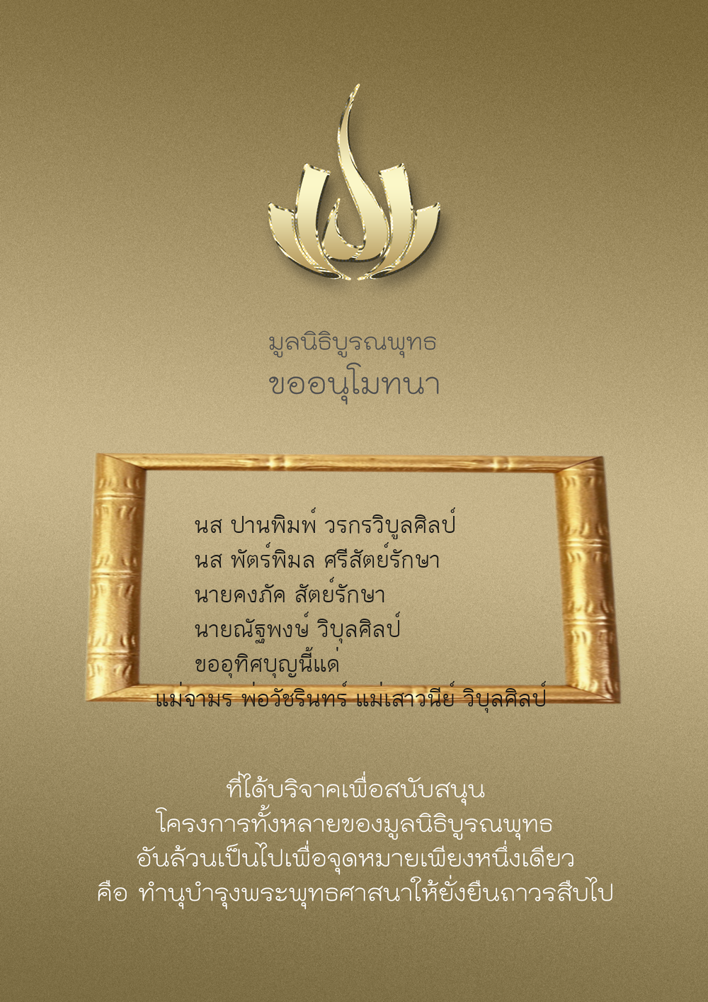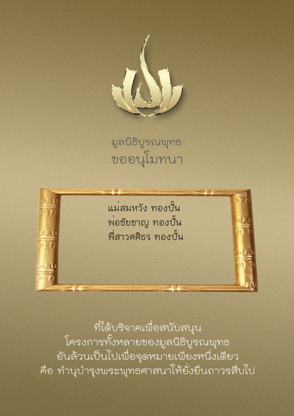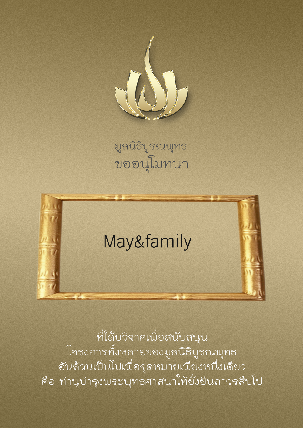 | ลำดับที่ 9947 | นาง อมราภรณ์ บุน และ ครอบครัว | 1,000.00 บาท | ภาพที่ระลึก |