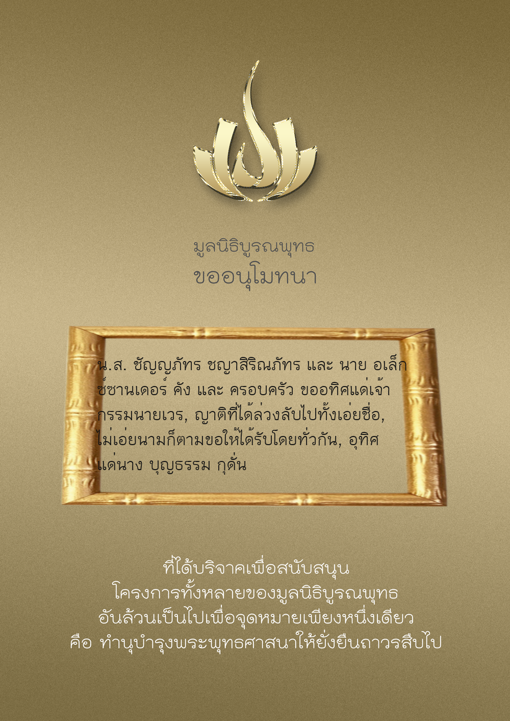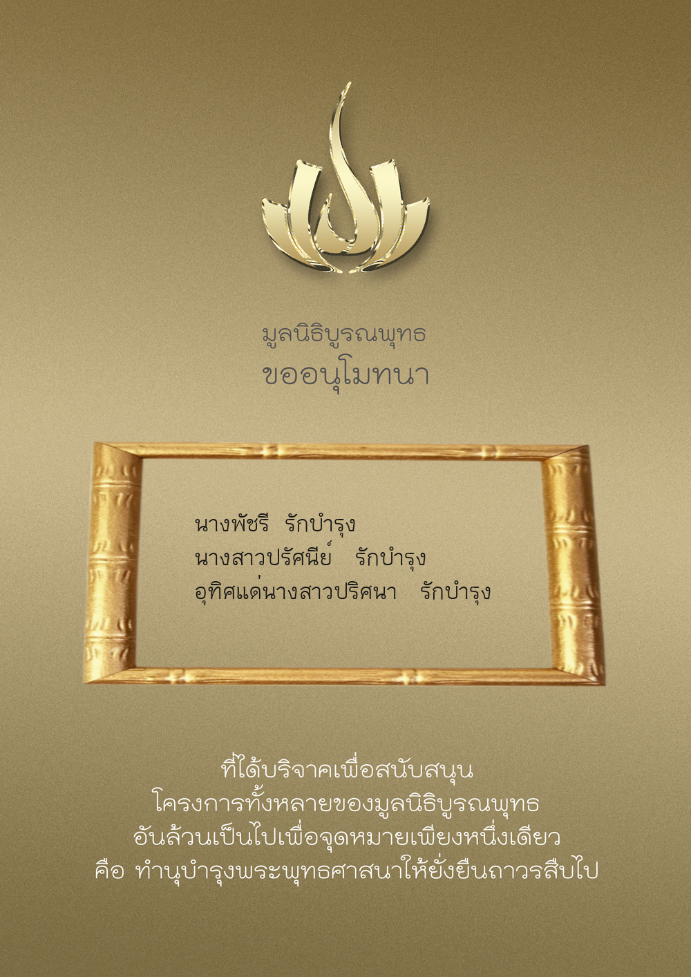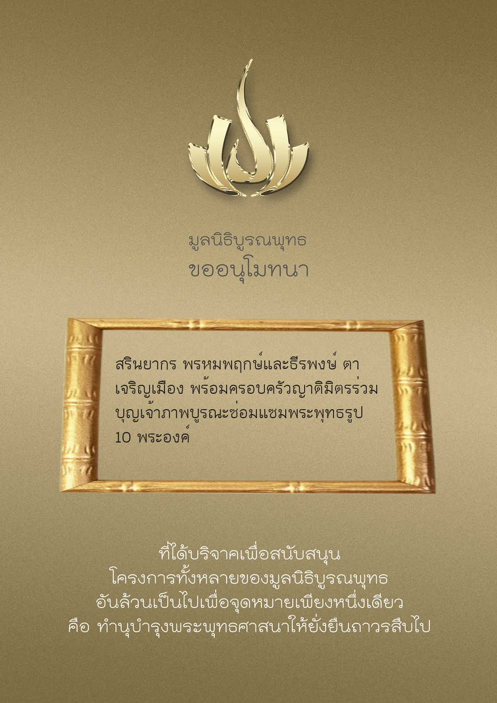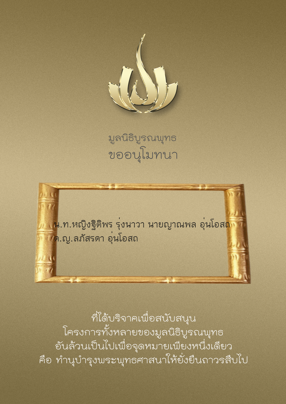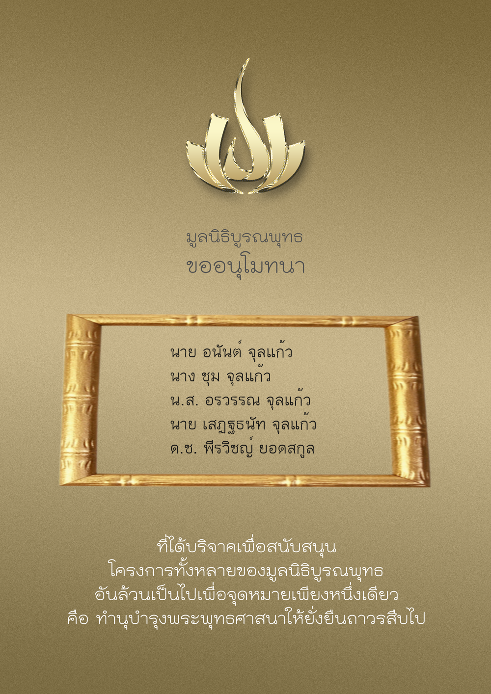 | ลำดับที่ 9947 | นาง อมราภรณ์ บุน และ ครอบครัว | 1,000.00 บาท | ภาพที่ระลึก |