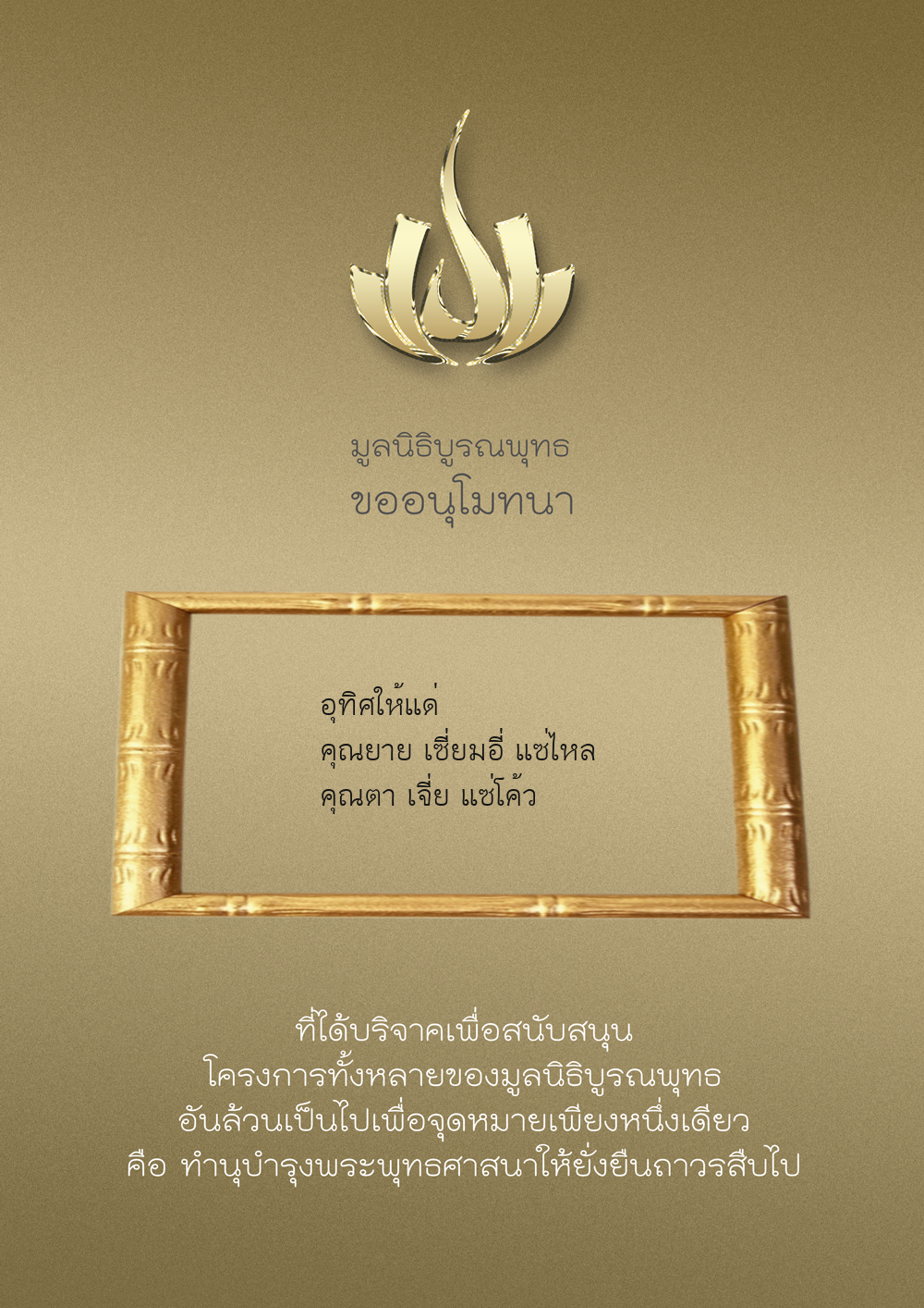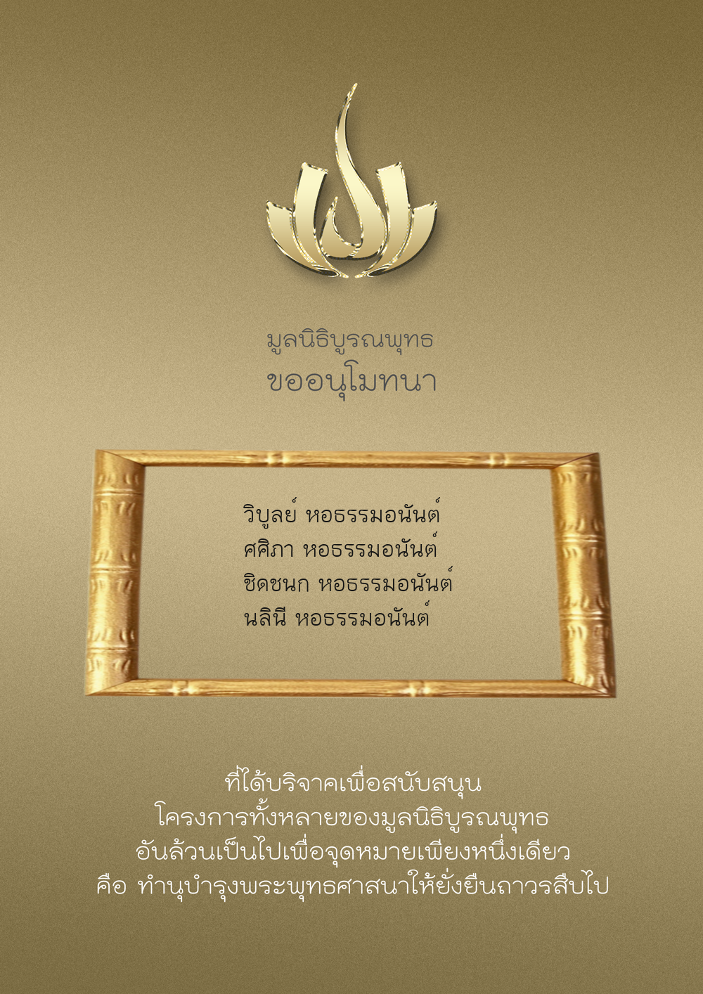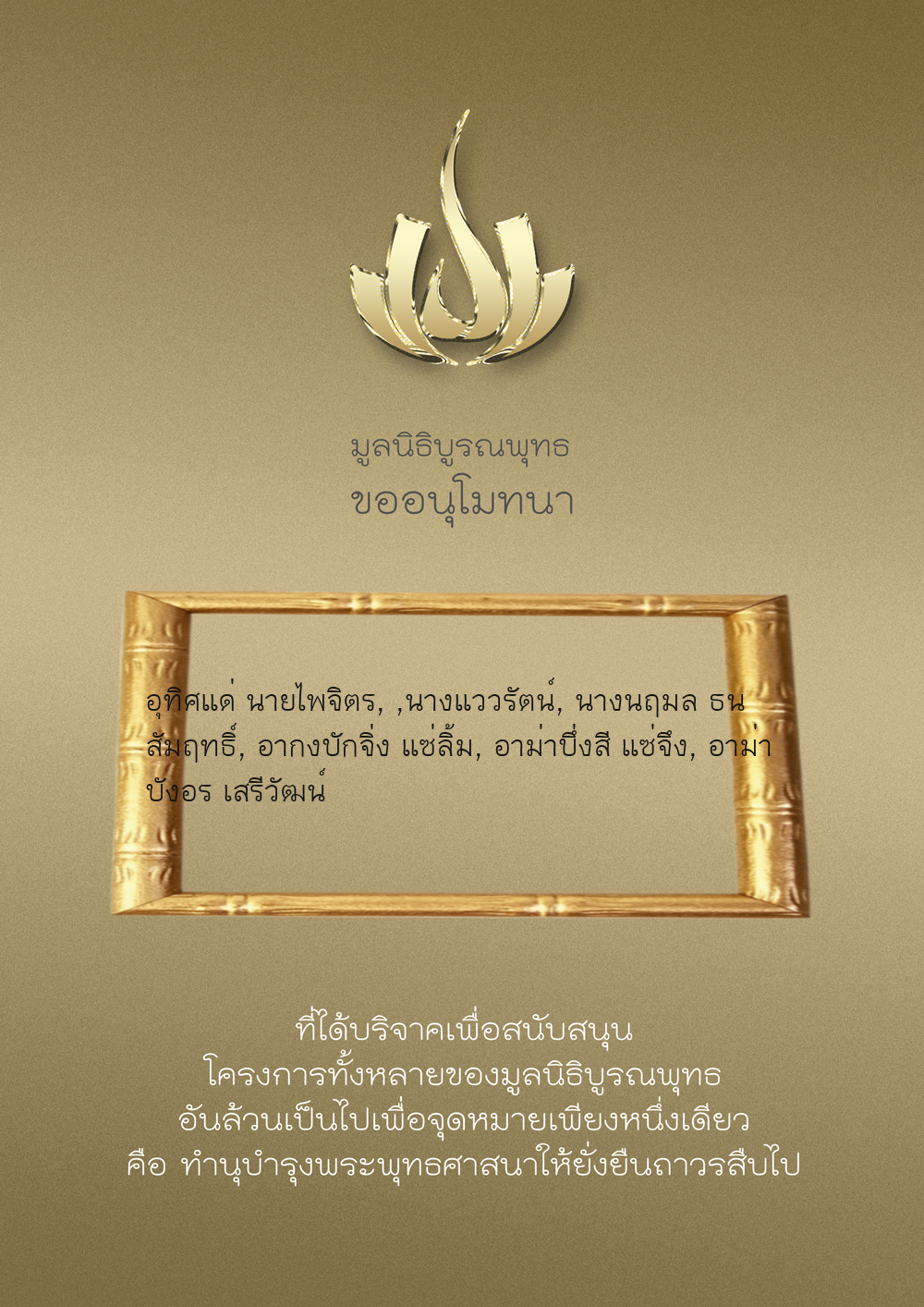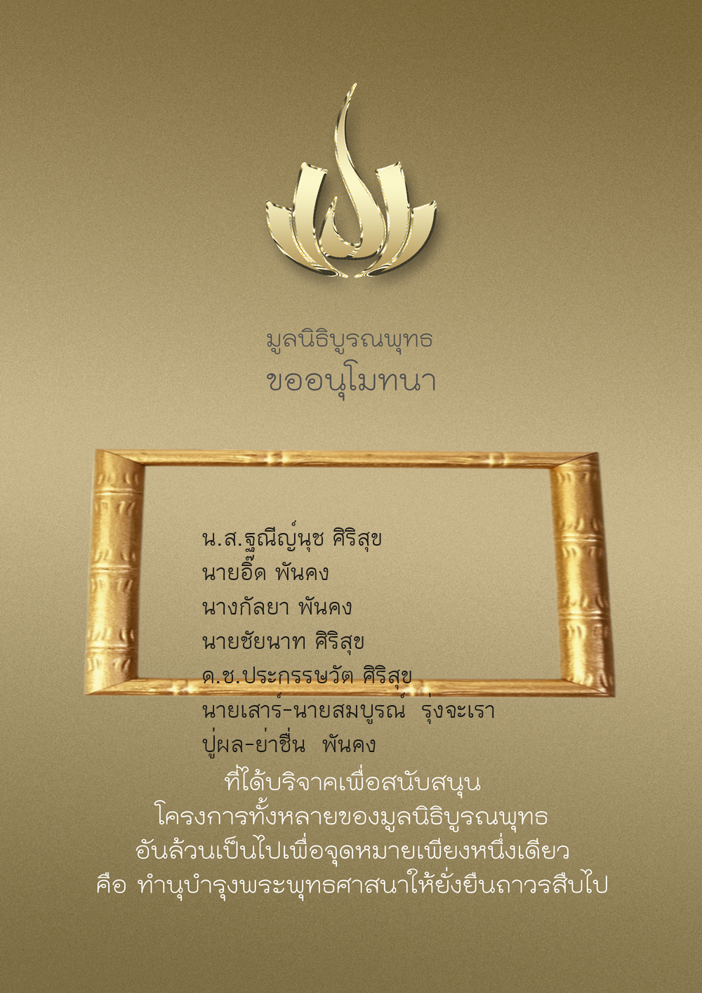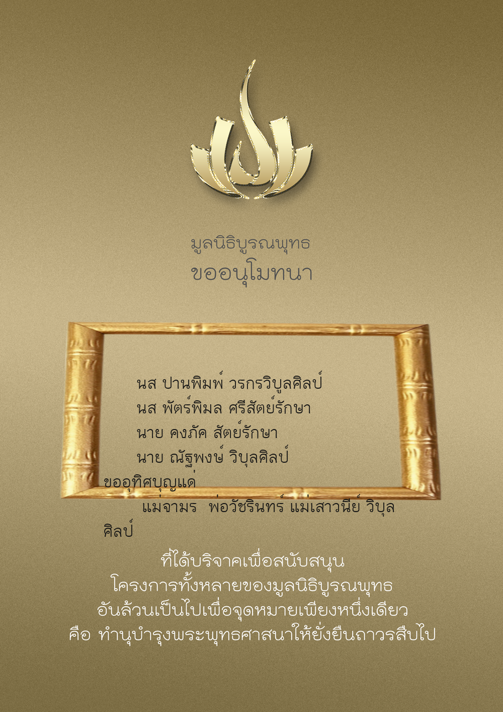 | ลำดับที่ 9947 | นาง อมราภรณ์ บุน และ ครอบครัว | 1,000.00 บาท | ภาพที่ระลึก |