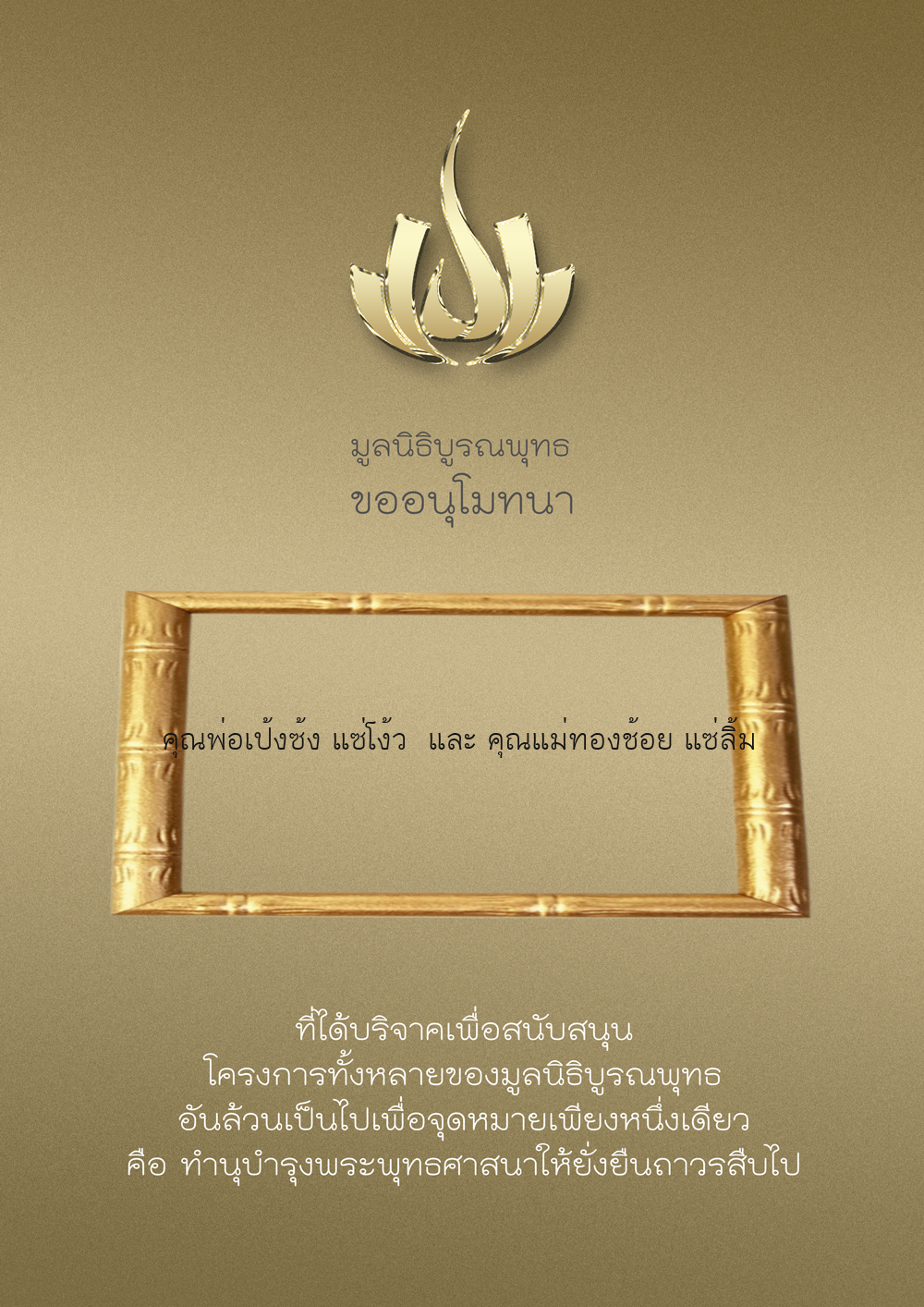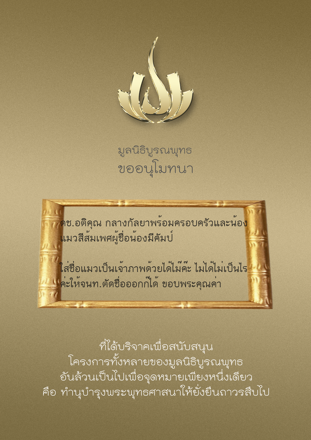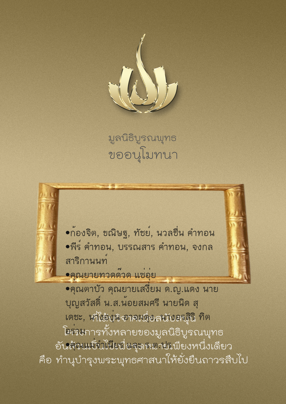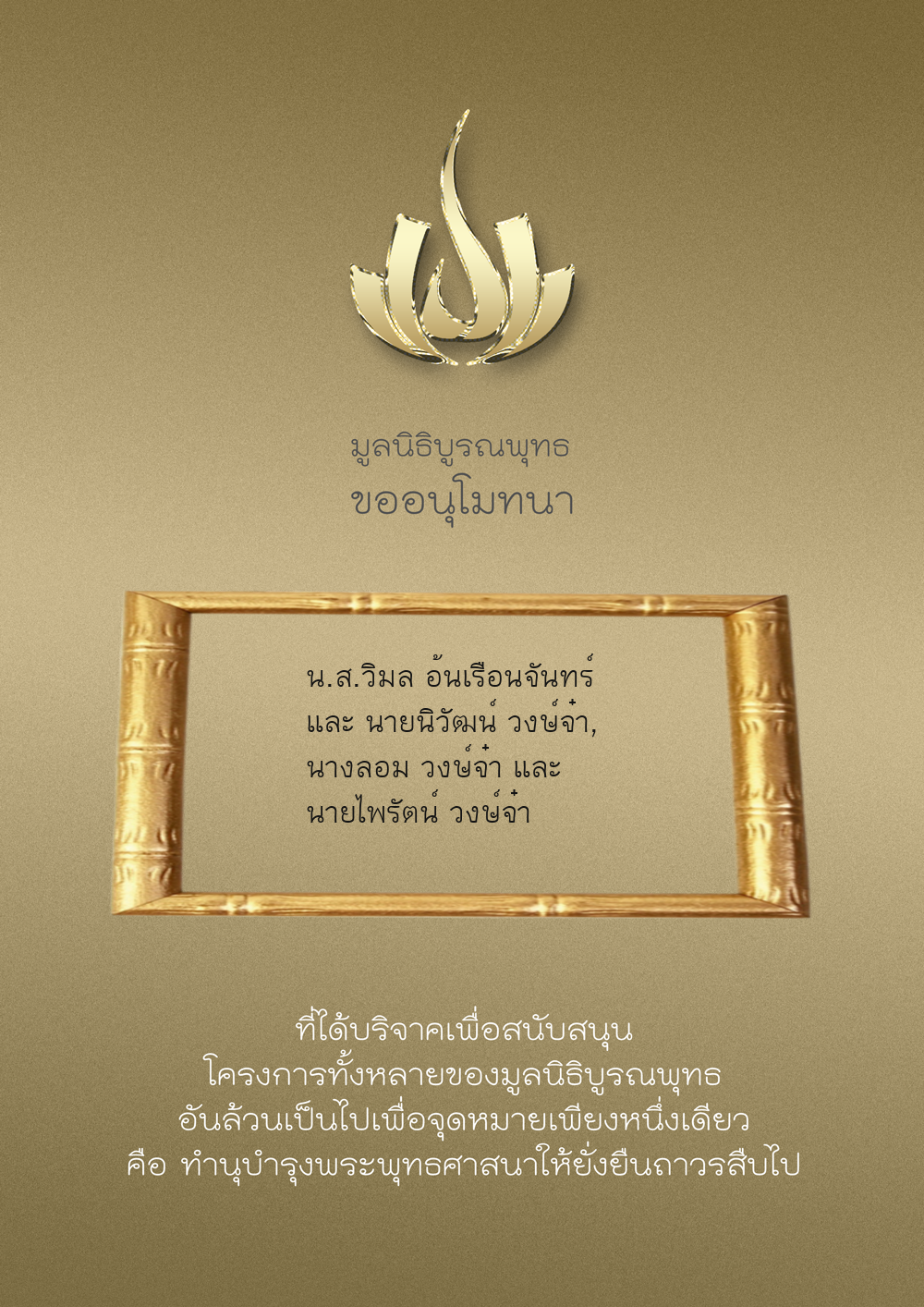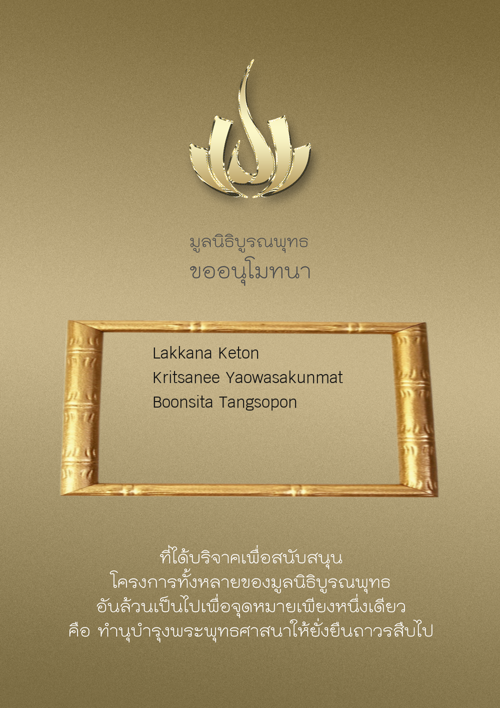 | ลำดับที่ 9947 | นาง อมราภรณ์ บุน และ ครอบครัว | 1,000.00 บาท | ภาพที่ระลึก |