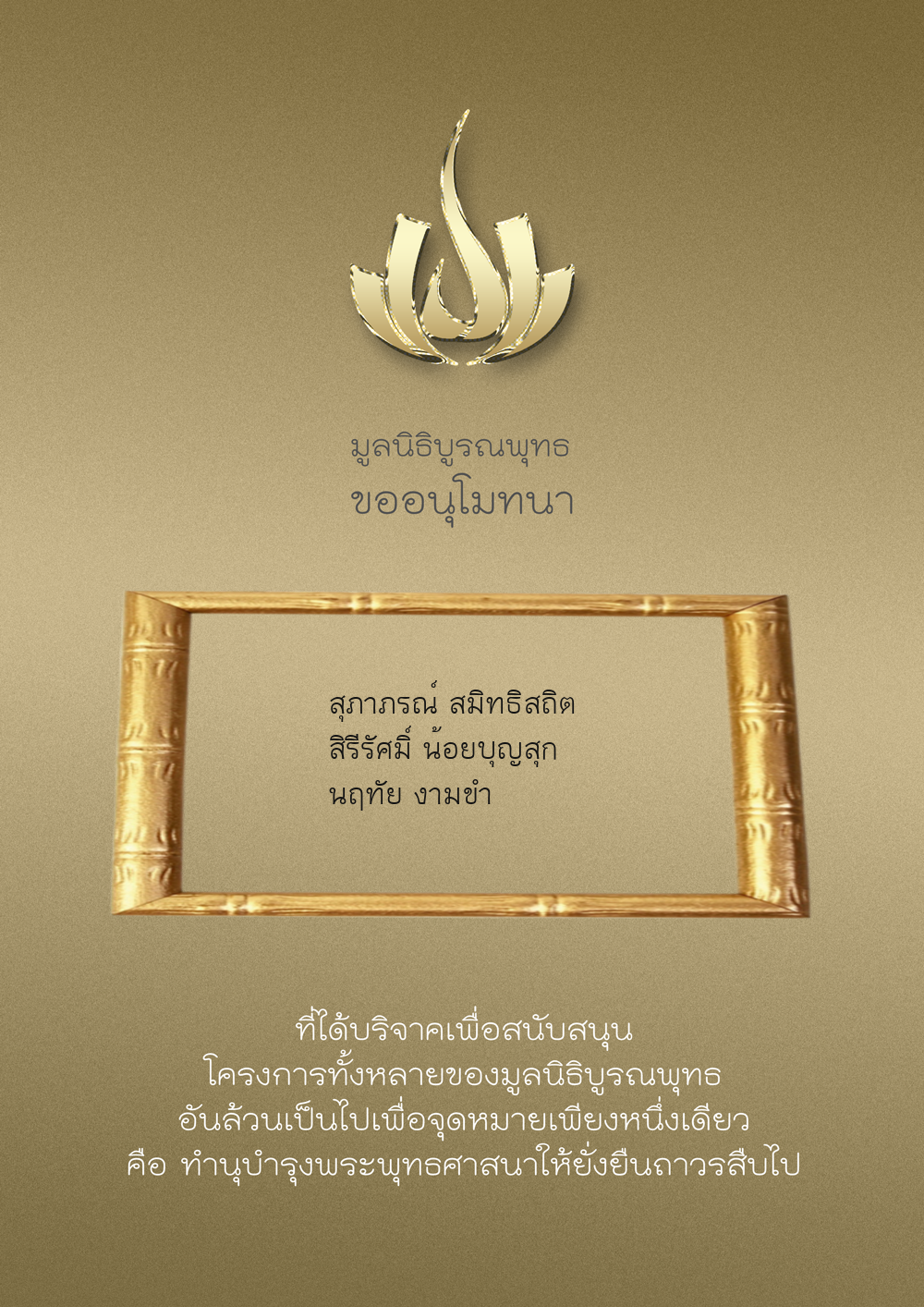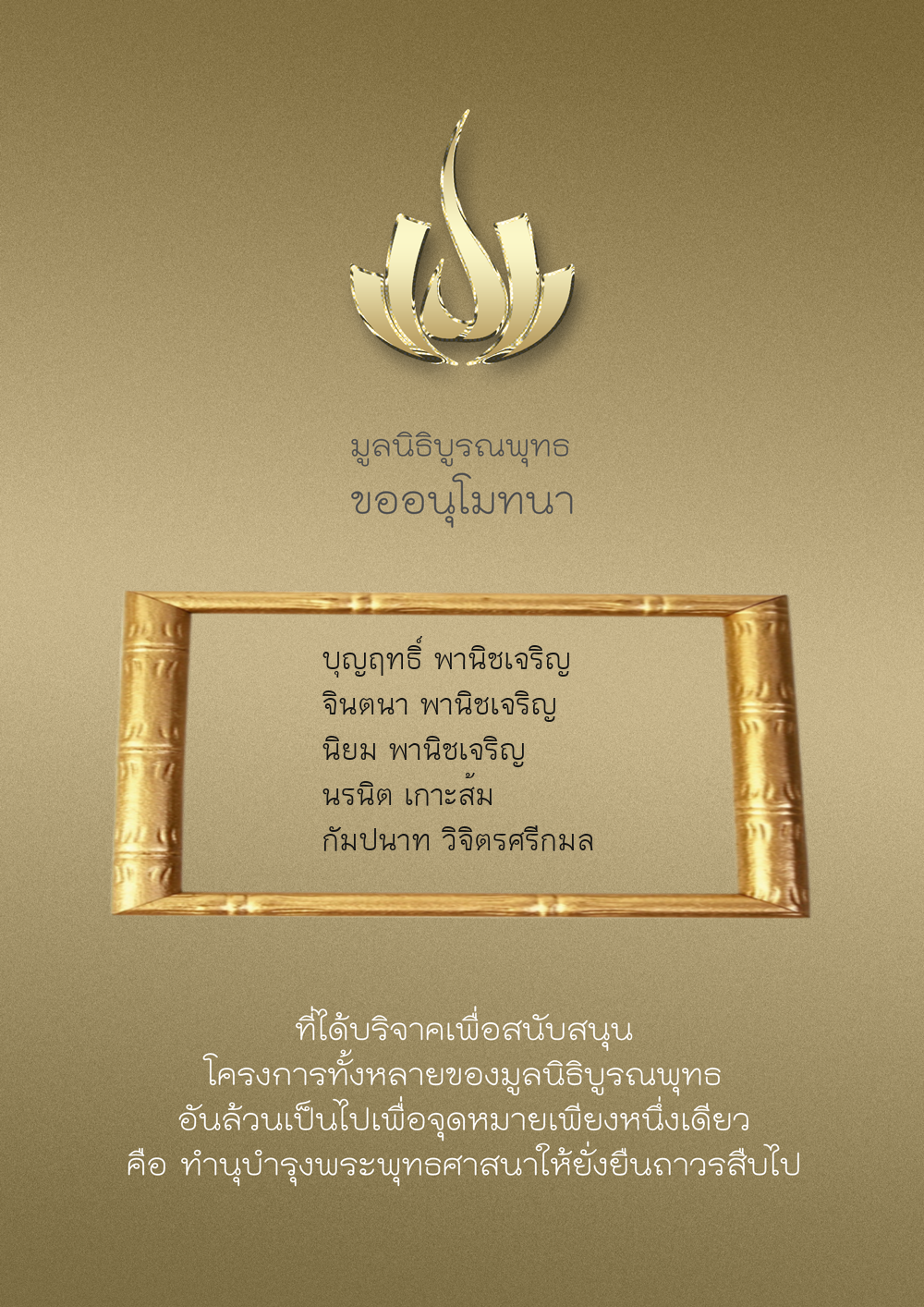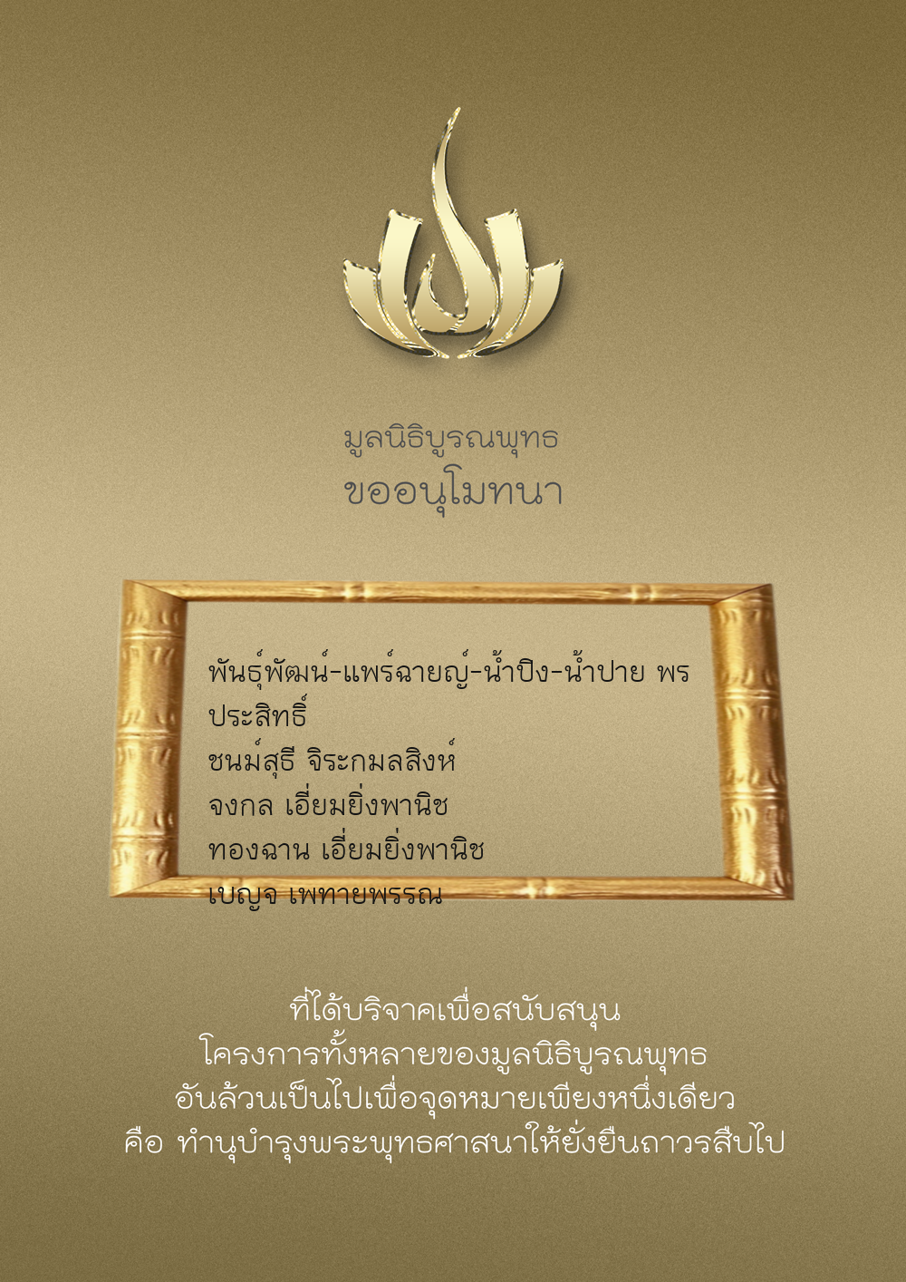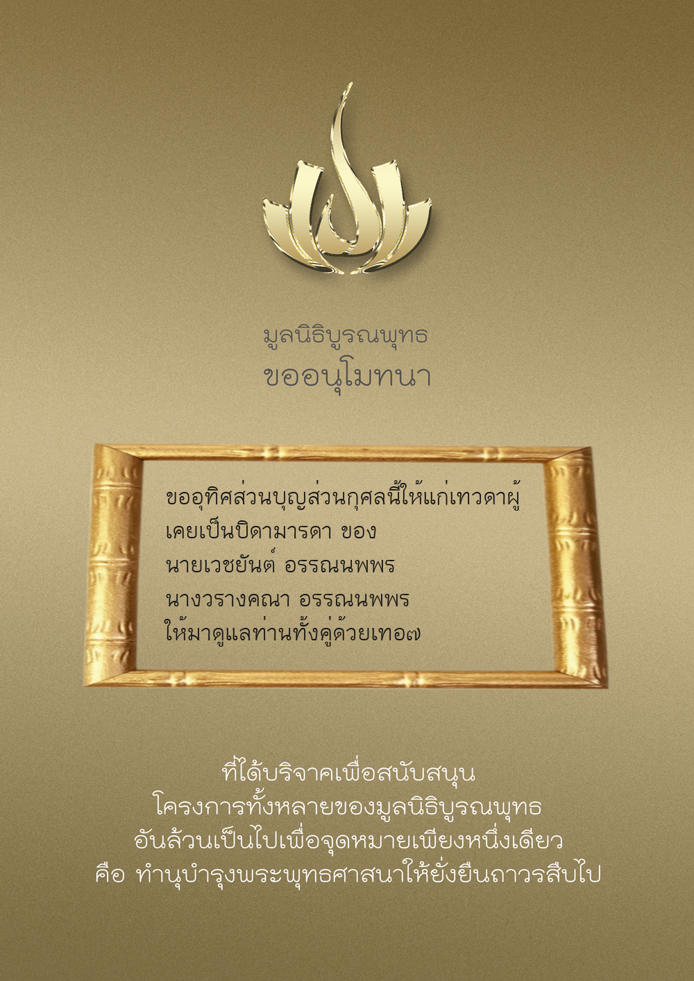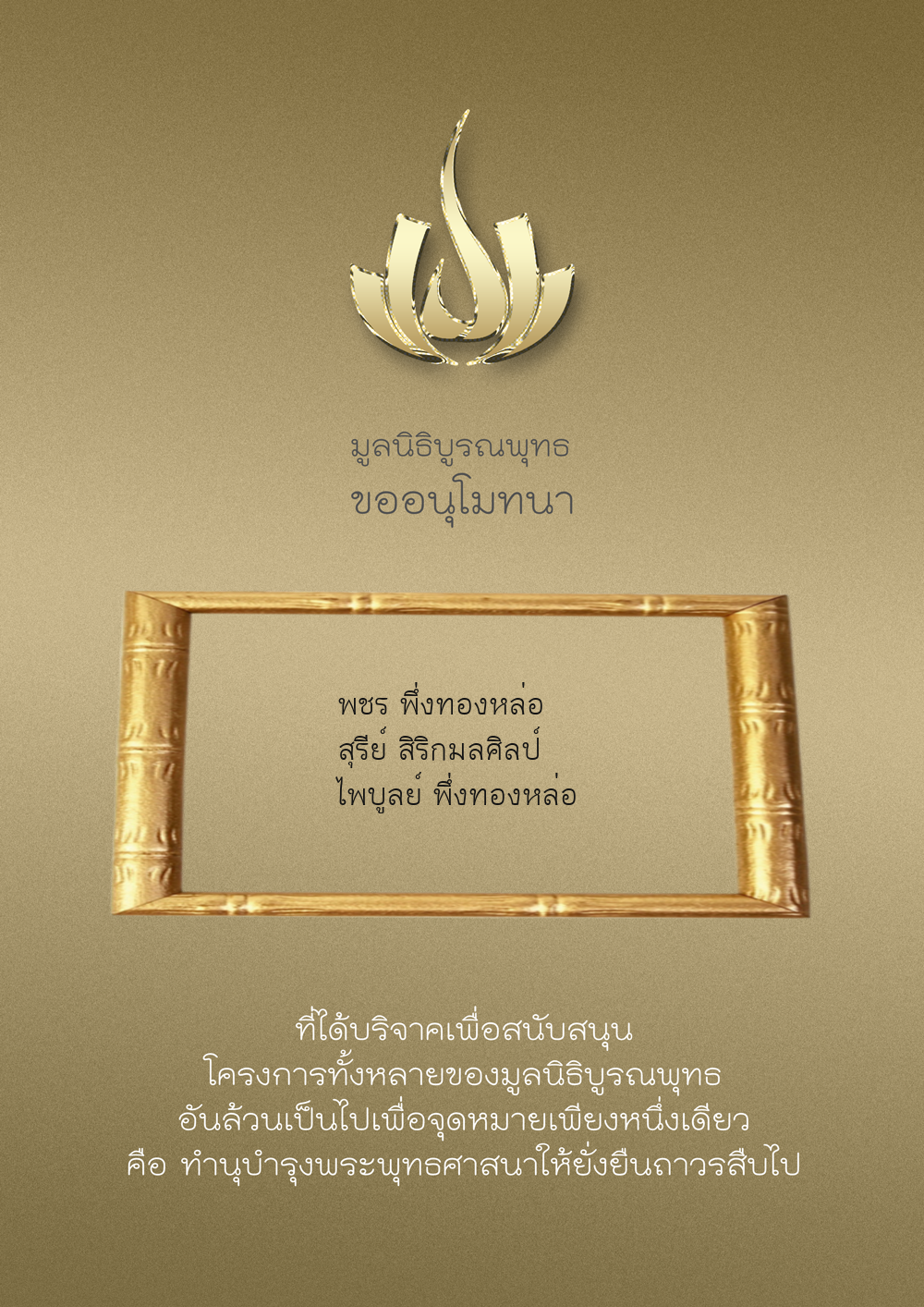 | ลำดับที่ 9947 | นาง อมราภรณ์ บุน และ ครอบครัว | 1,000.00 บาท | ภาพที่ระลึก |