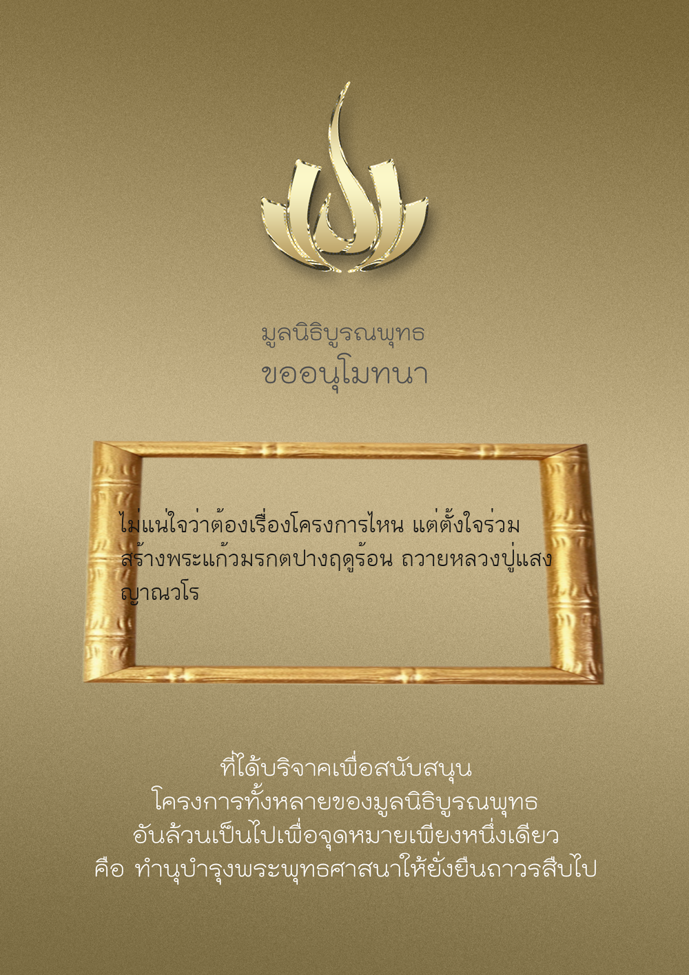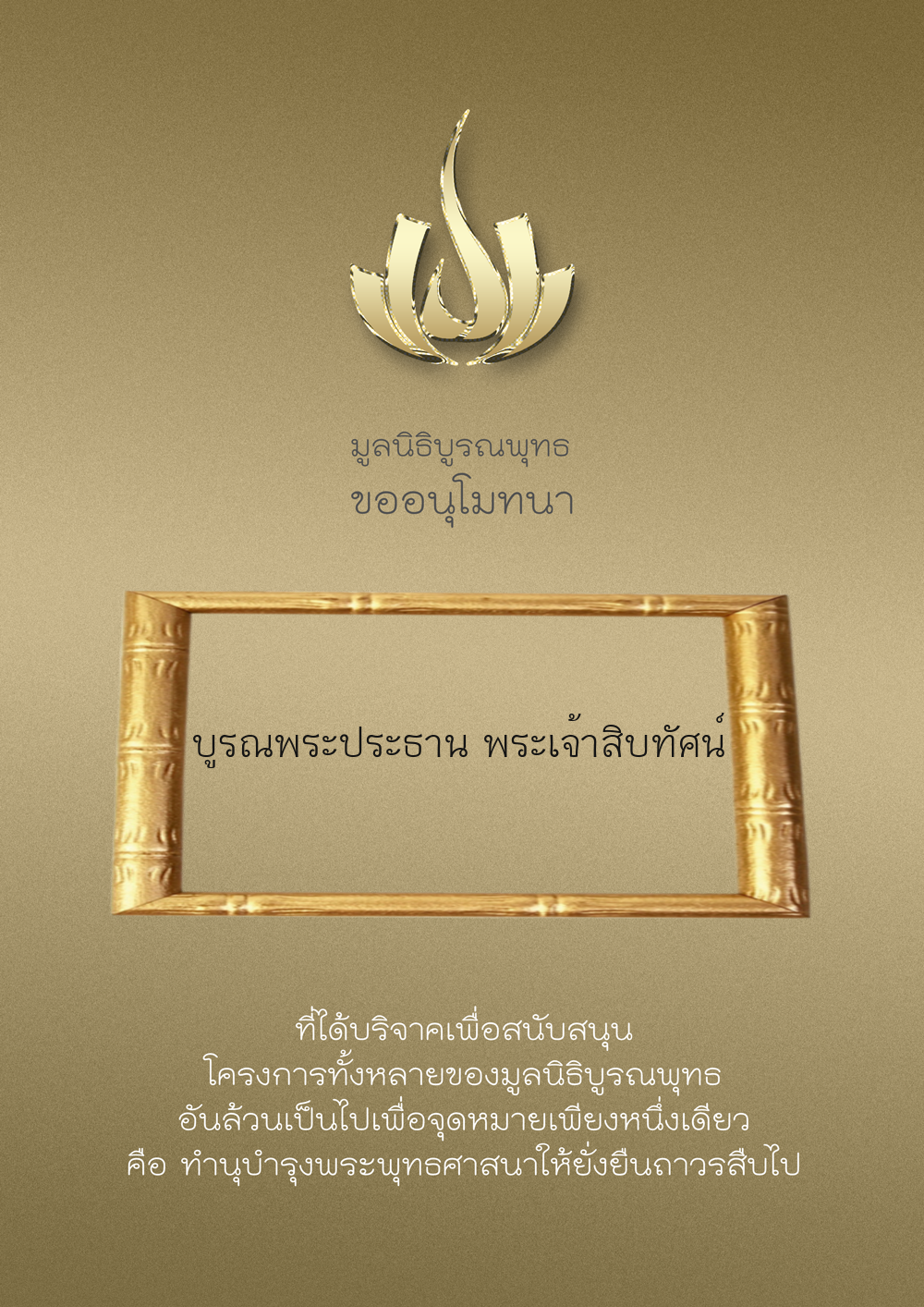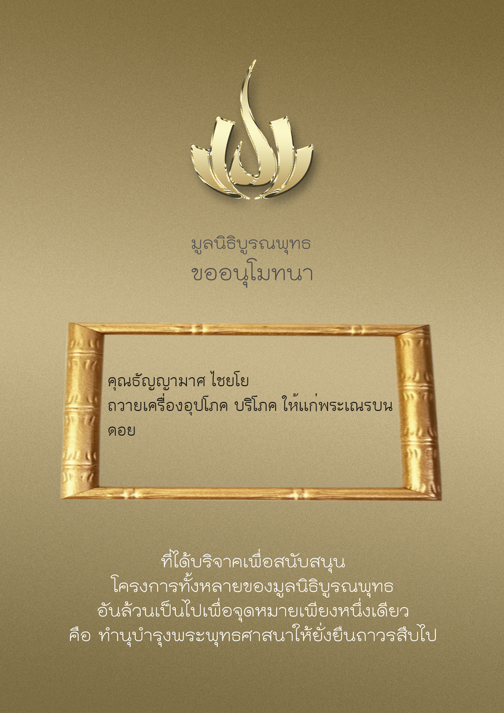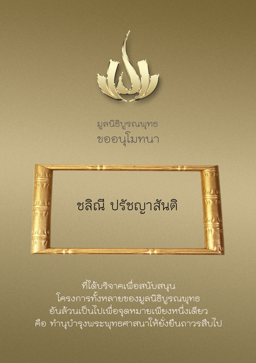 | ลำดับที่ 9986 | มูลนิธิบูรณพุทธ | 2,222.00 บาท | ภาพที่ระลึก |