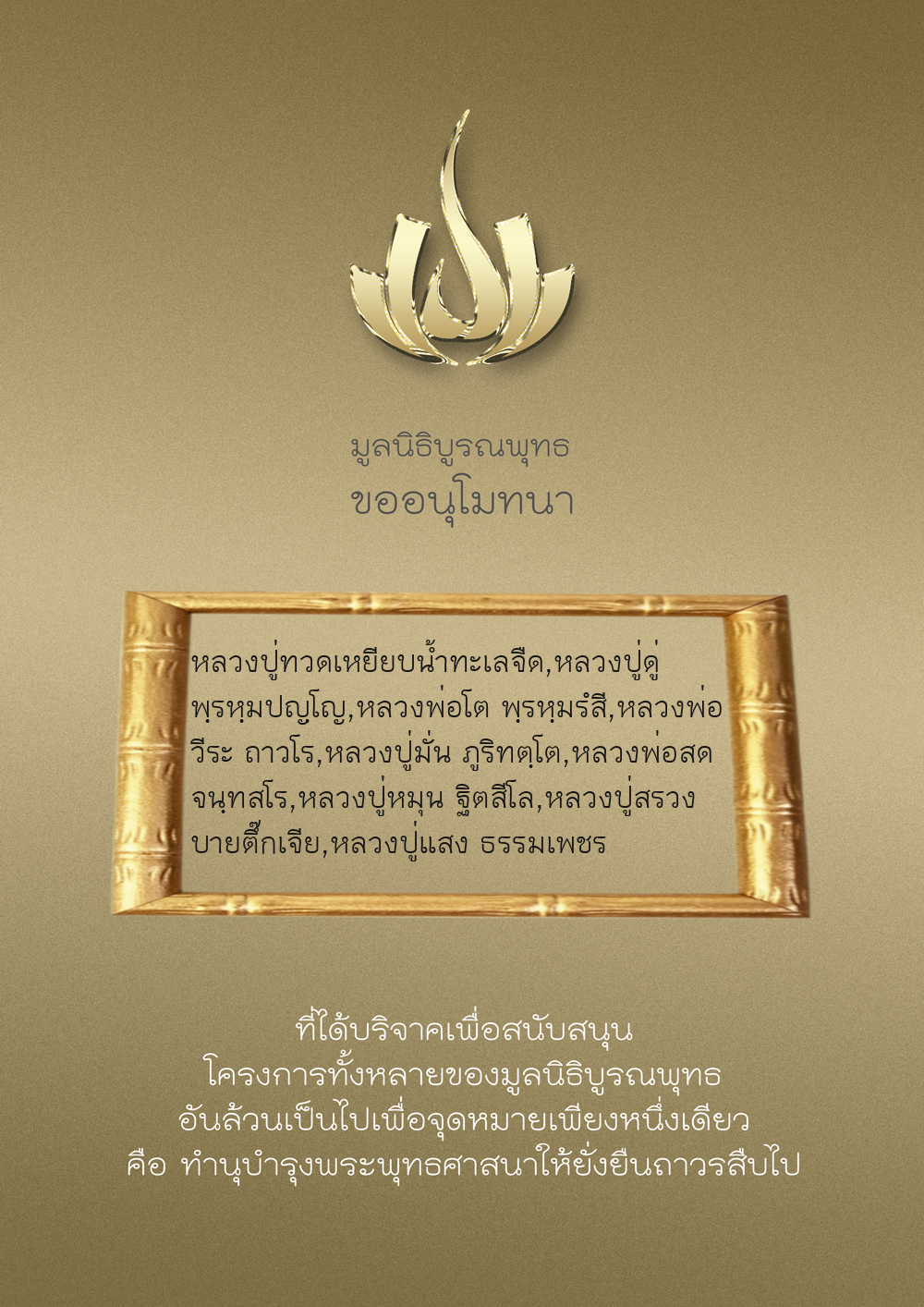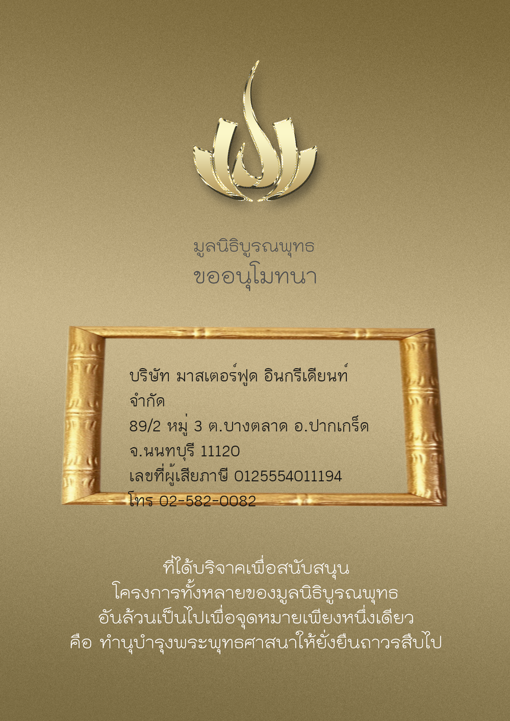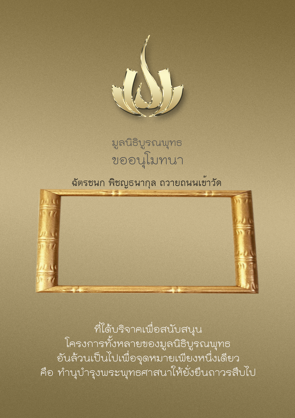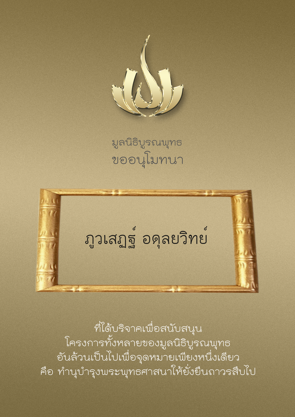 | ลำดับที่ 9986 | มูลนิธิบูรณพุทธ | 2,222.00 บาท | ภาพที่ระลึก |