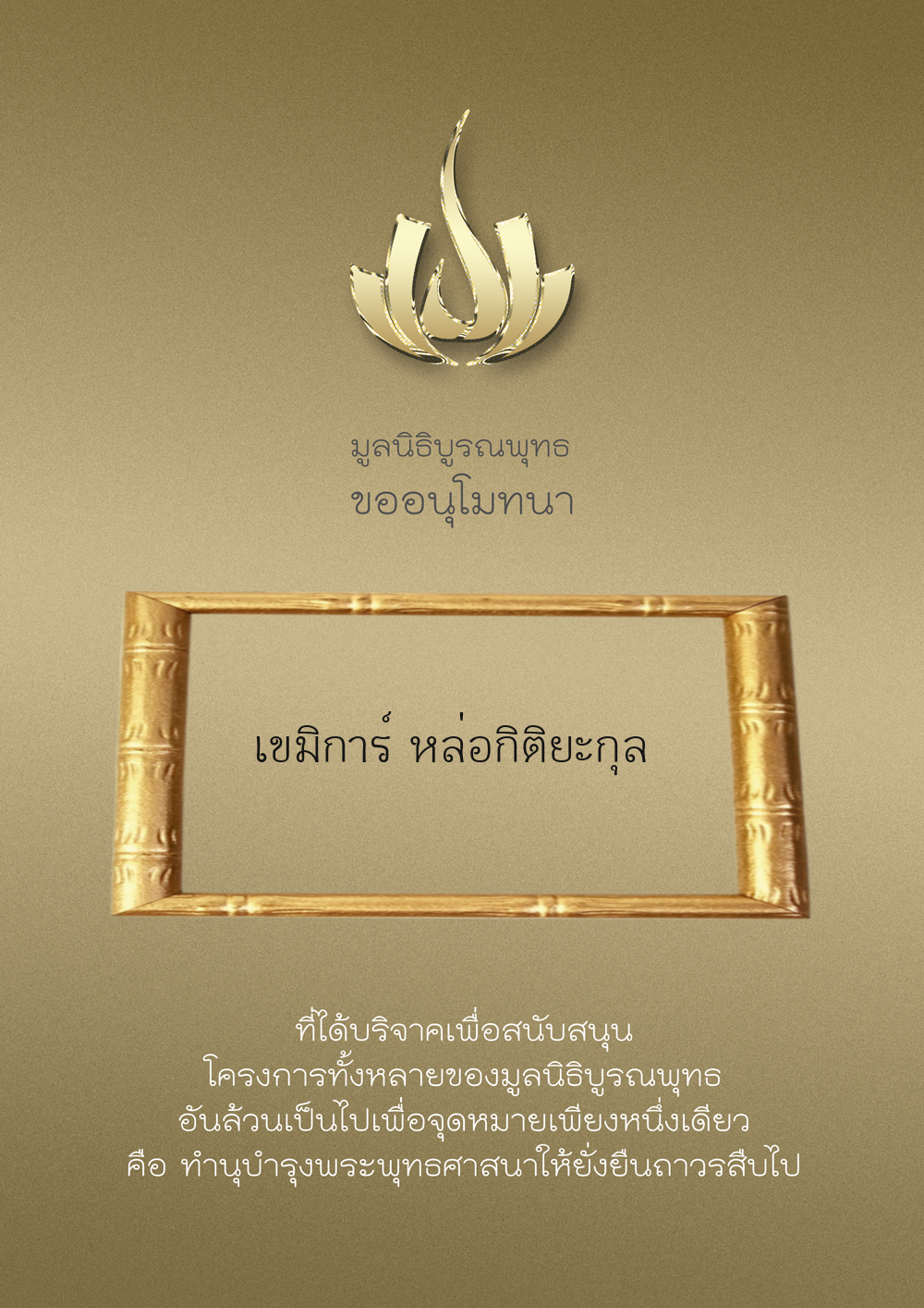 | ลำดับที่ 33 | อโณทัย เวทยากร และครอบครัว | 1,000.00 บาท | ภาพที่ระลึก |