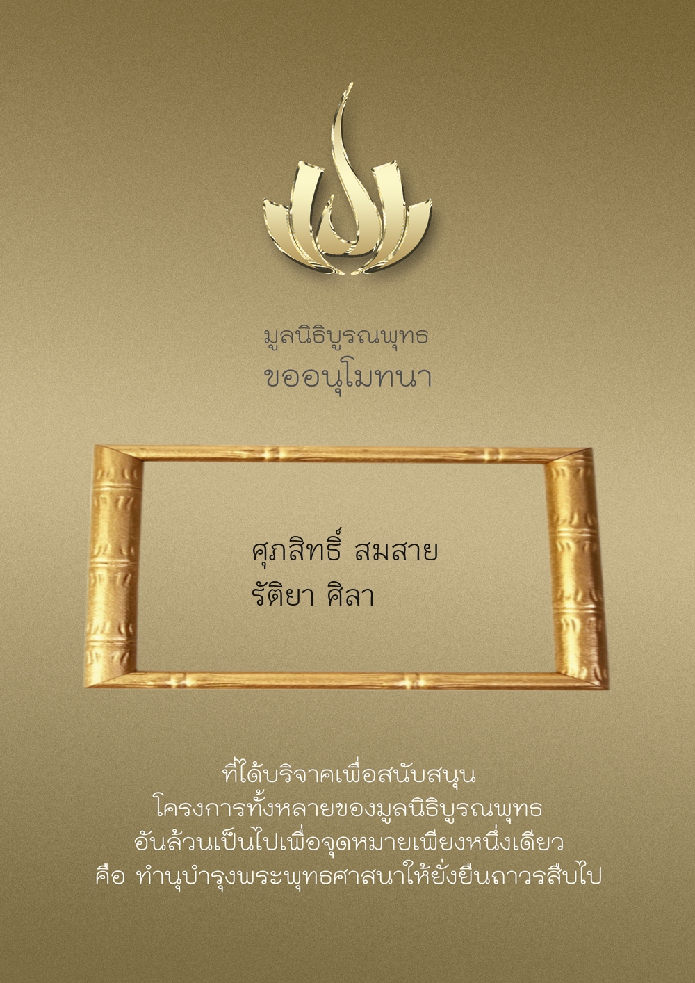 | ลำดับที่ 8 | สุพจน์ ปัญญา และ ครอบครัว | 500.00 บาท | ภาพที่ระลึก |