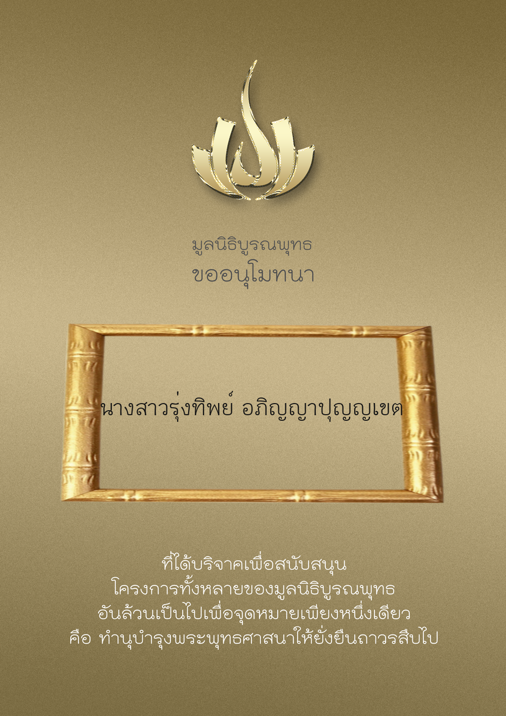 | ลำดับที่ 9984 | คุณรุ่งทิพย์ อภิญญาปุญญเขต | 200.00 บาท | ภาพที่ระลึก |