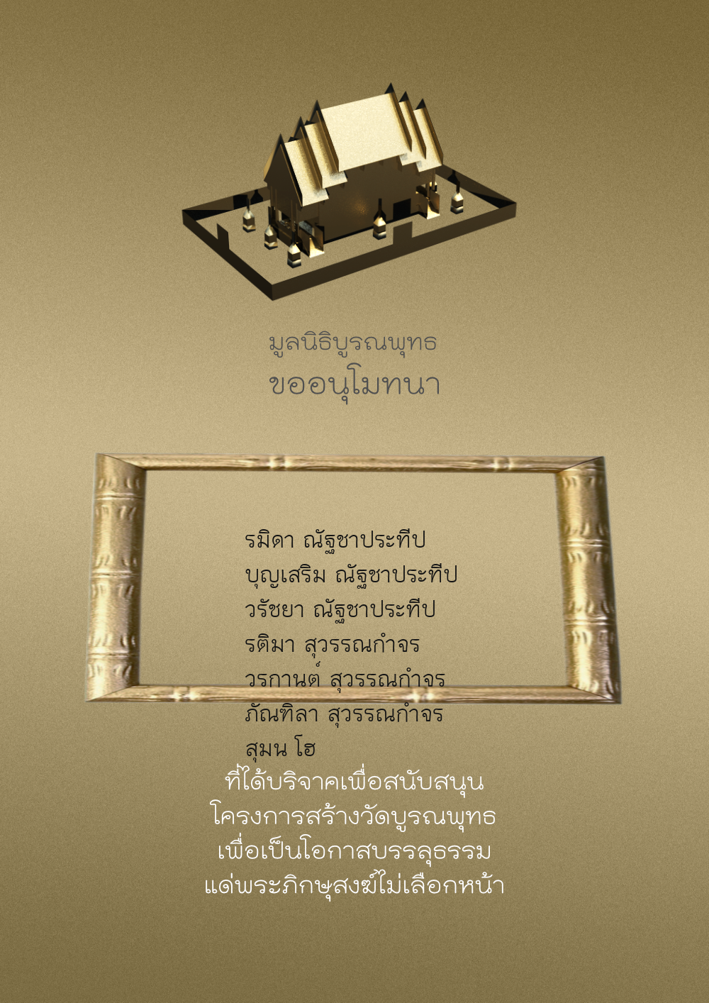 | ลำดับที่ 408 | นางภัทรนันท์ สุดรุ่ง อุทิศให้เจ้ากรรมนายเวร | 700.00 บาท | ภาพที่ระลึก |
