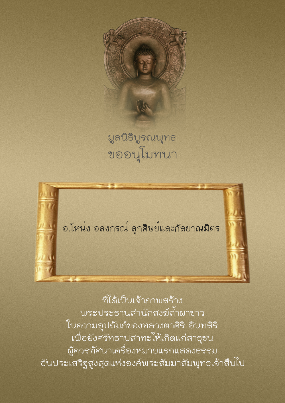| ลำดับที่ 214 | อ.โหน่ง อลงกรณ์ ลูกศิษย์และกัลยาณมิตร | 1,000.00 บาท | ภาพที่ระลึก |