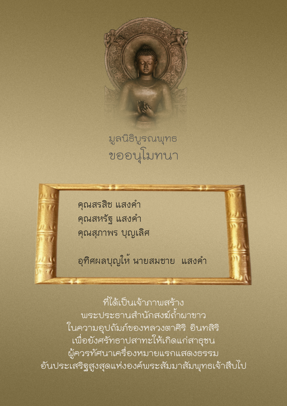 คุณสรสิช แสงคำ คุณสหรัฐ แสงคำ อุทิศผลบุญให้นายสมชาย แสงคำ | 200.03 บาท | ภาพที่ระลึก |