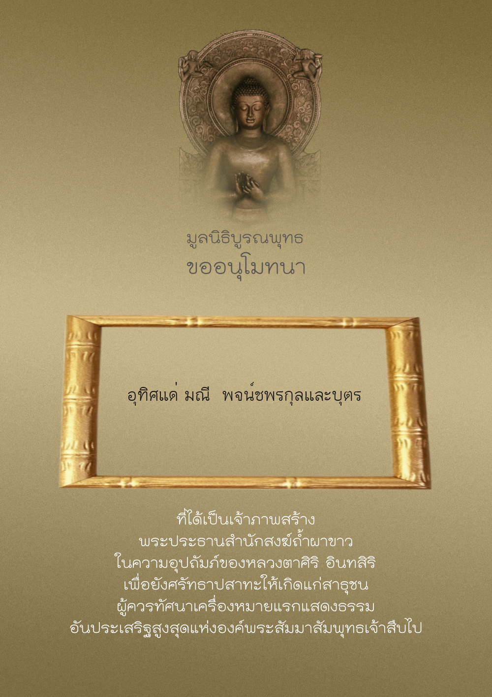 | ลำดับที่ 208 | อุทิศแด่ นางภาณี อ่องสุขสันต์ ฯ | 100.00 บาท | ภาพที่ระลึก |