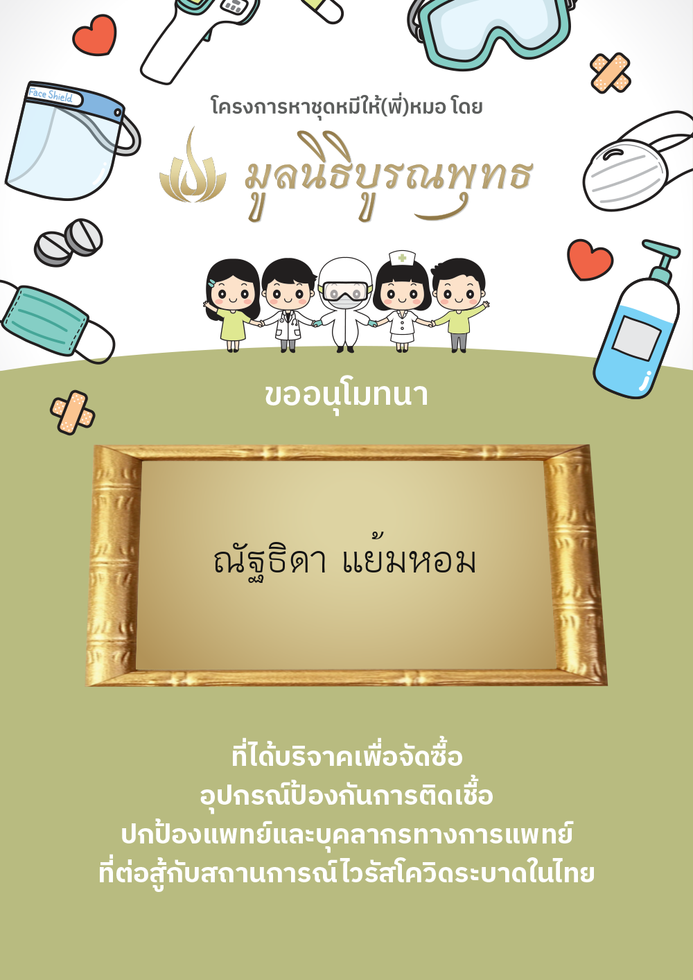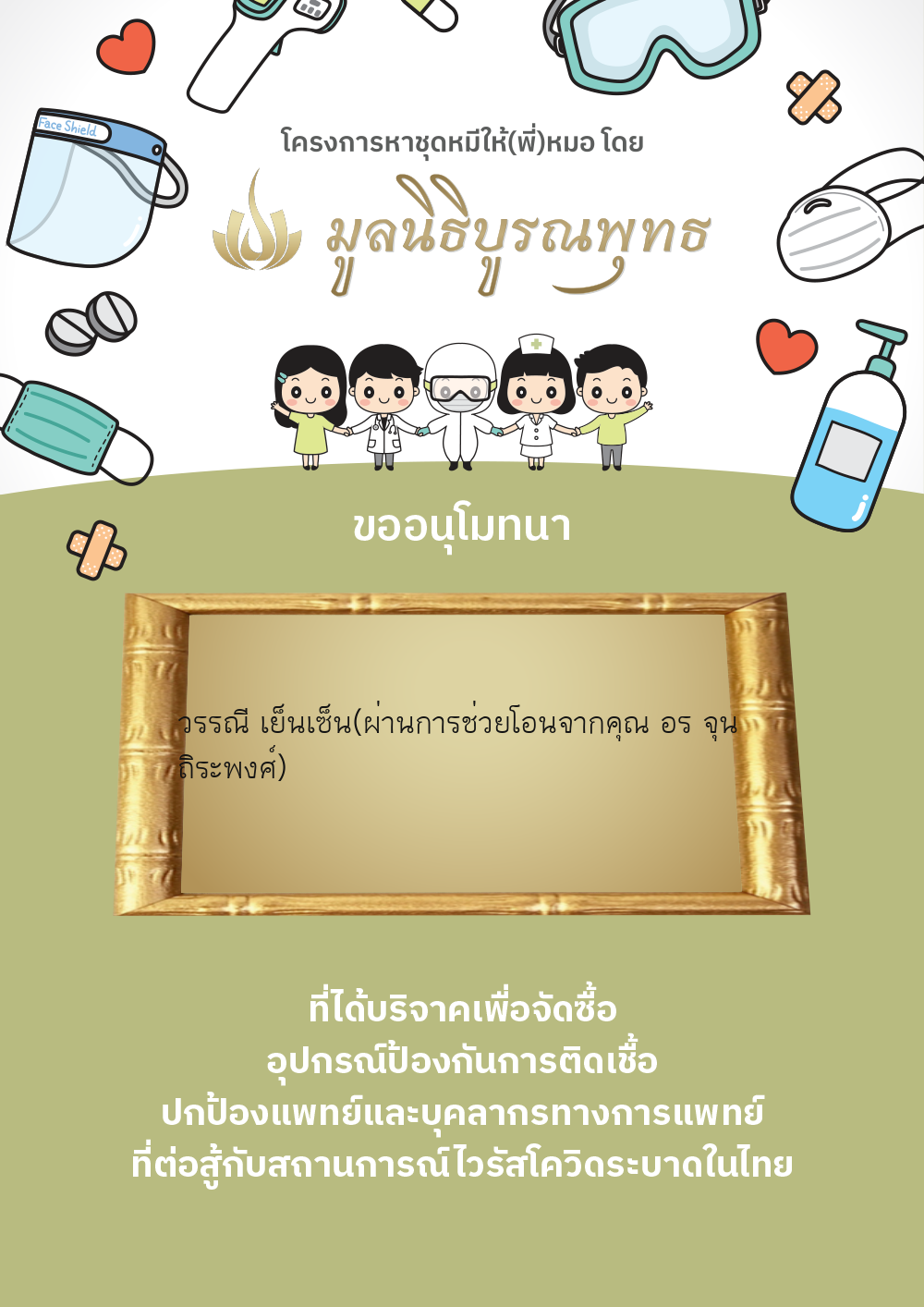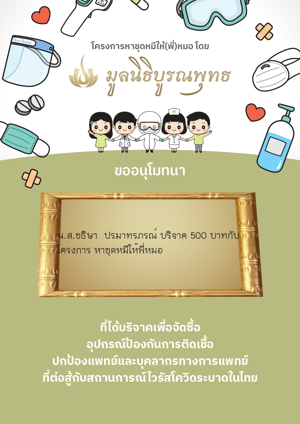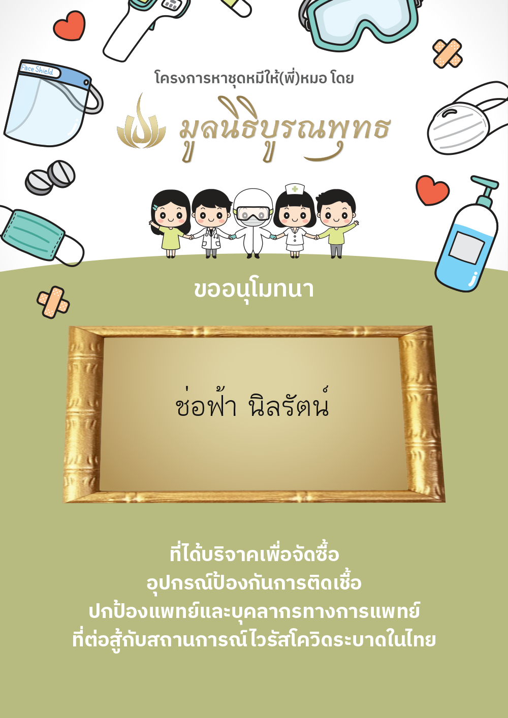 | ลำดับที่ 2030 | แมสของแท้ให้พี่หมอ | 1,000.00 บาท | ภาพที่ระลึก |
