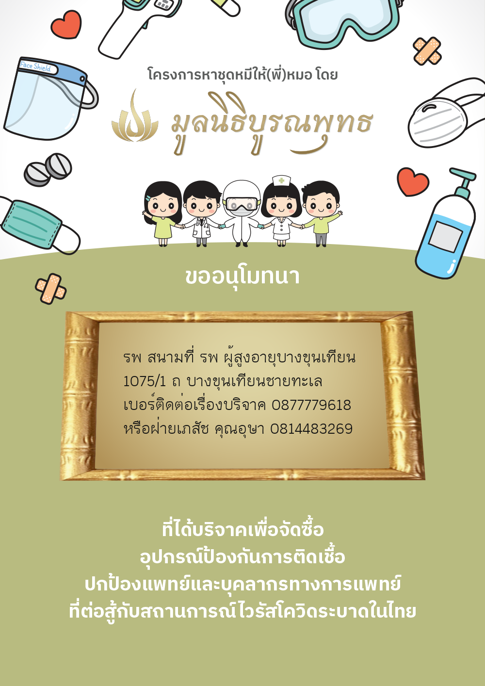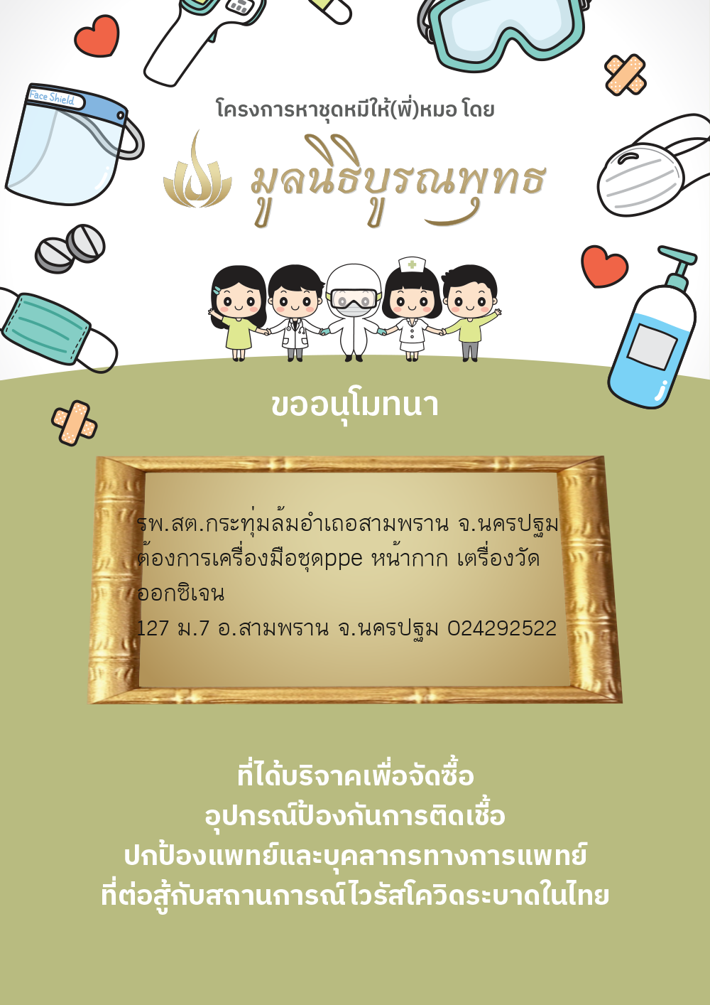 ต้องการเครื่องมือชุดppe หน้ากาก เตรื่องวัด ออกซิเจน 127 ม.7 อ.สามพราน จ.นครปฐม 024292522 | 1,000.00 บาท | ภาพที่ระลึก |