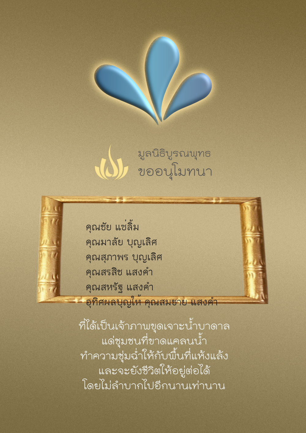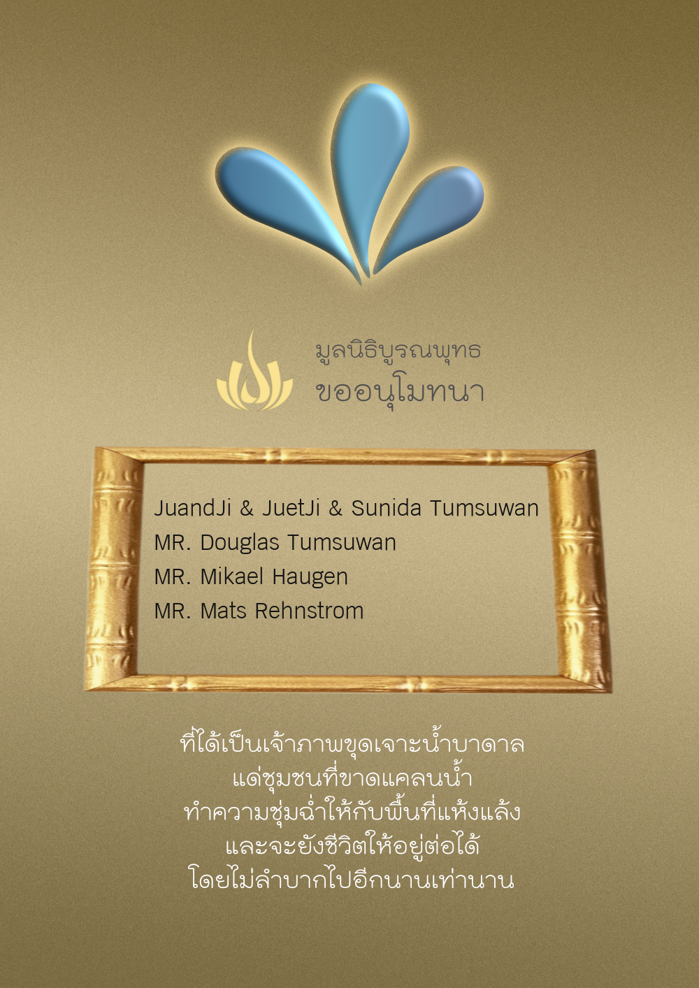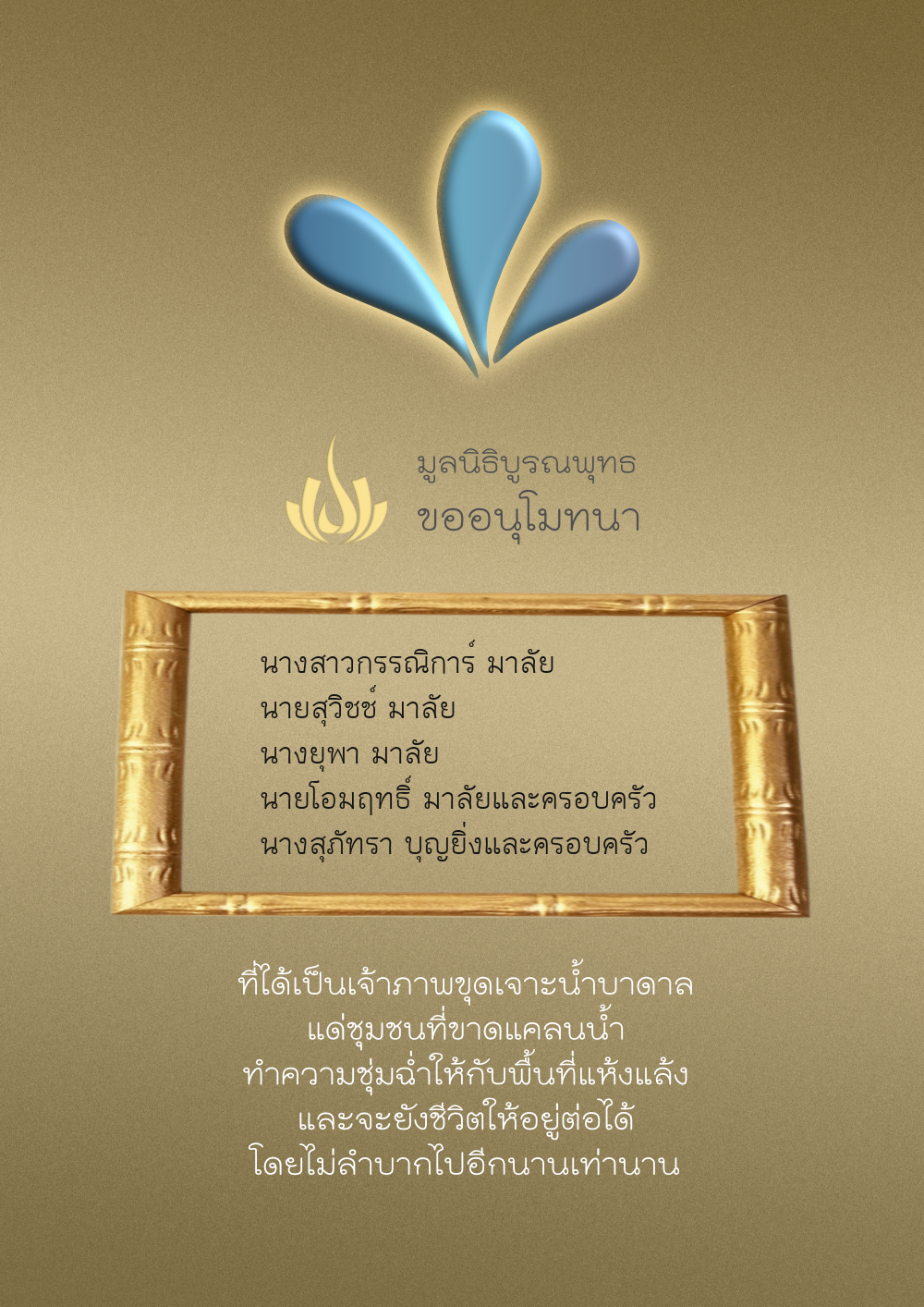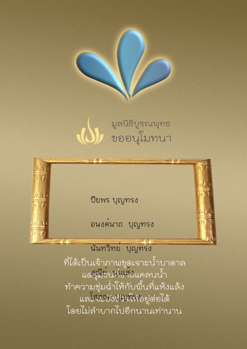 | ลำดับที่ 35 | ธงชัย-สุเพ็ญพร-มาคุณ เกษมสุขสกุล | 1,000.00 บาท | ภาพที่ระลึก |