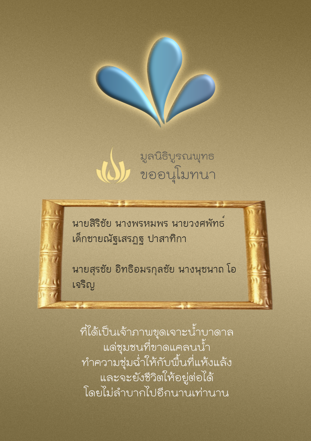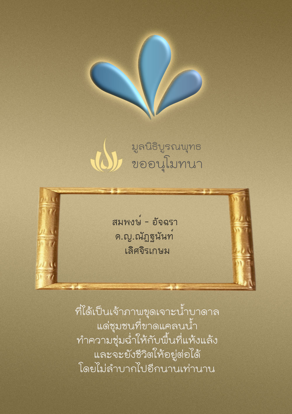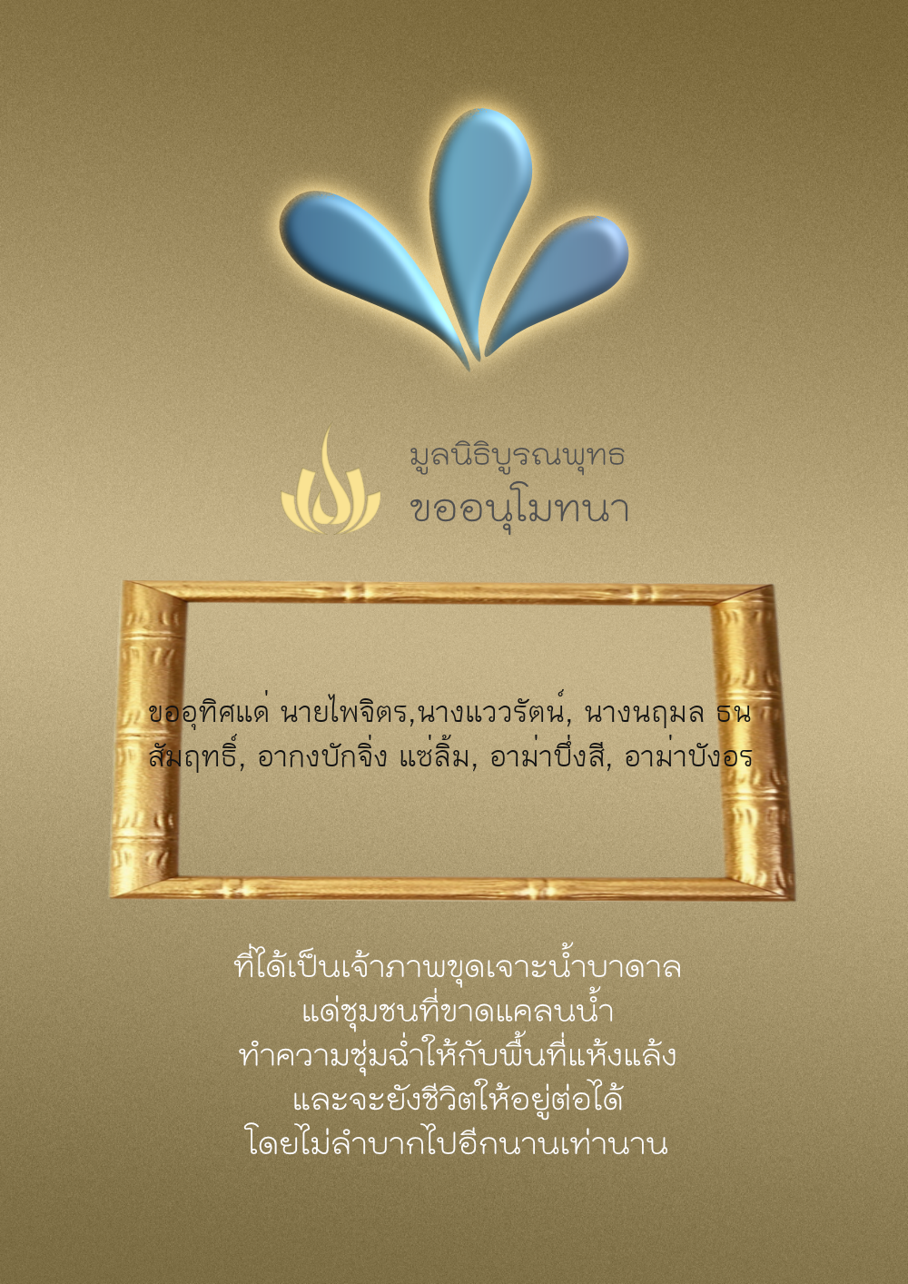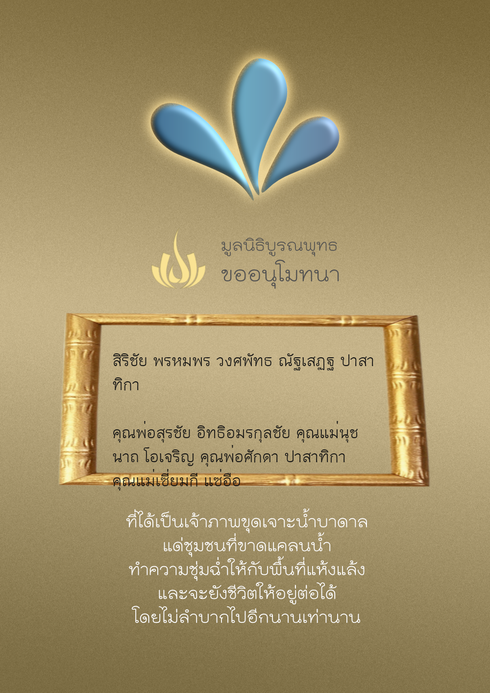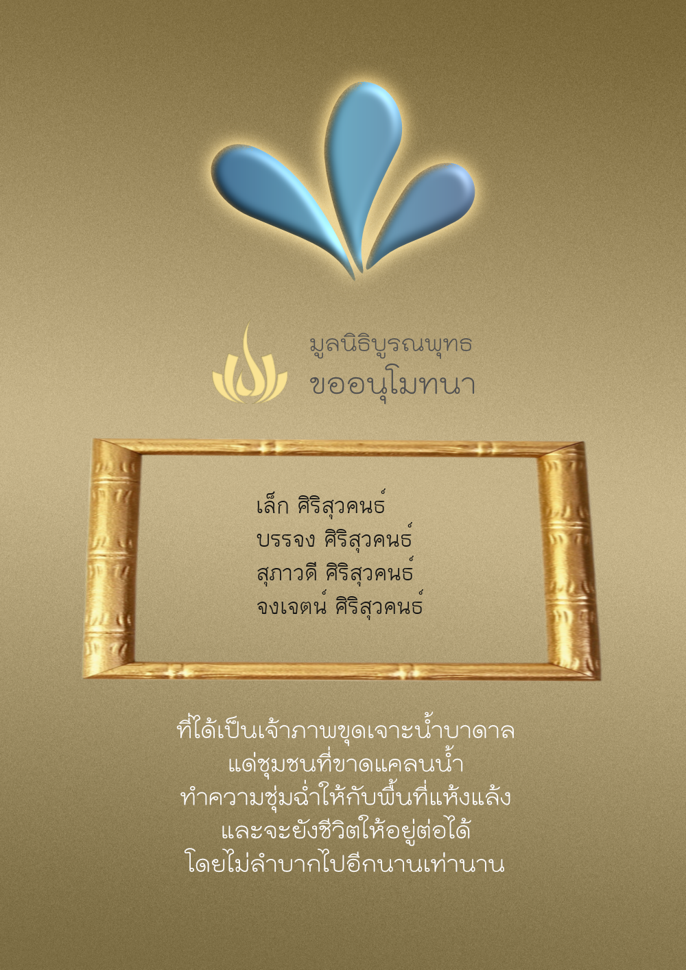 | ลำดับที่ 35 | ธงชัย-สุเพ็ญพร-มาคุณ เกษมสุขสกุล | 1,000.00 บาท | ภาพที่ระลึก |