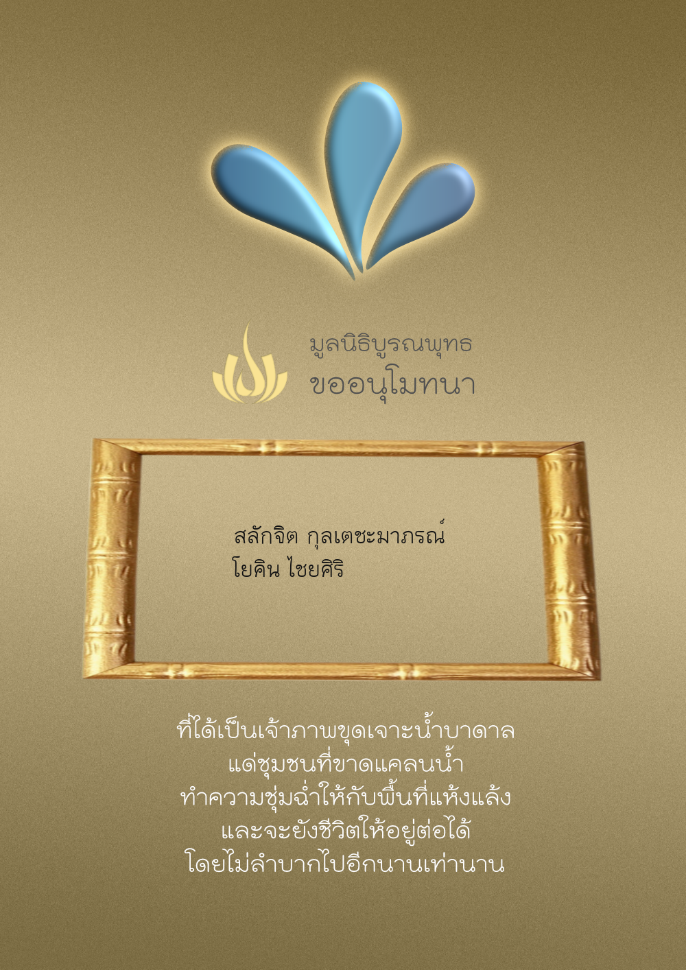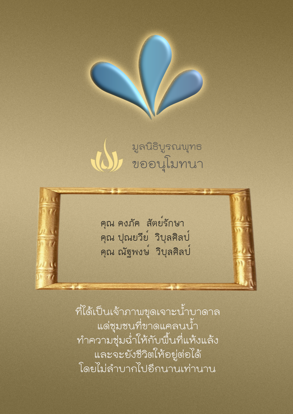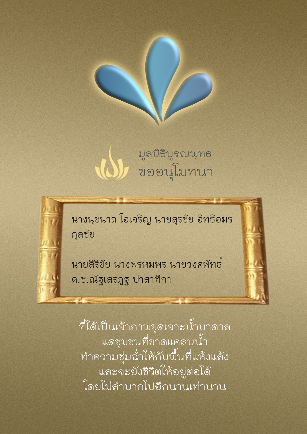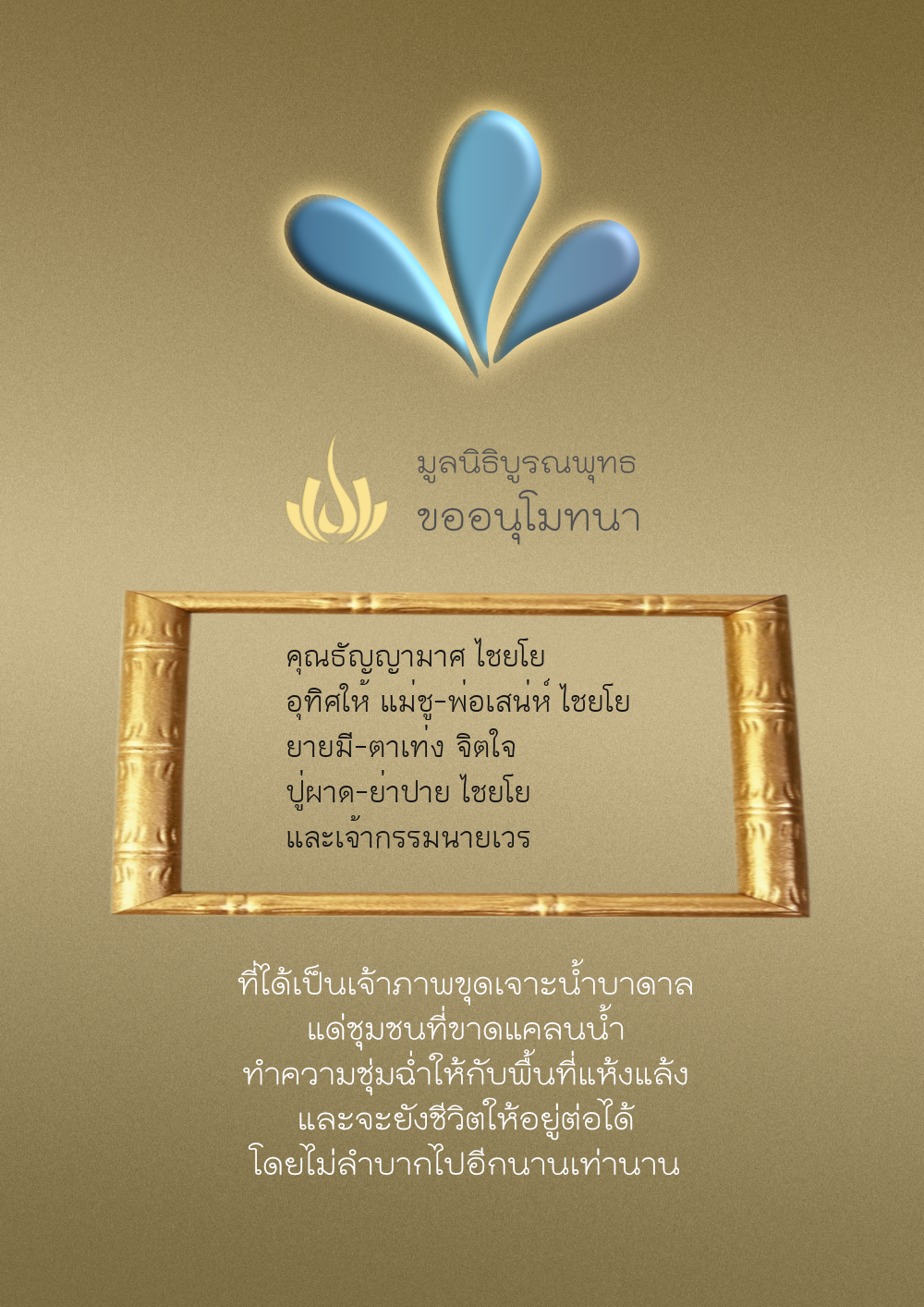 | ลำดับที่ 35 | ธงชัย-สุเพ็ญพร-มาคุณ เกษมสุขสกุล | 1,000.00 บาท | ภาพที่ระลึก |
