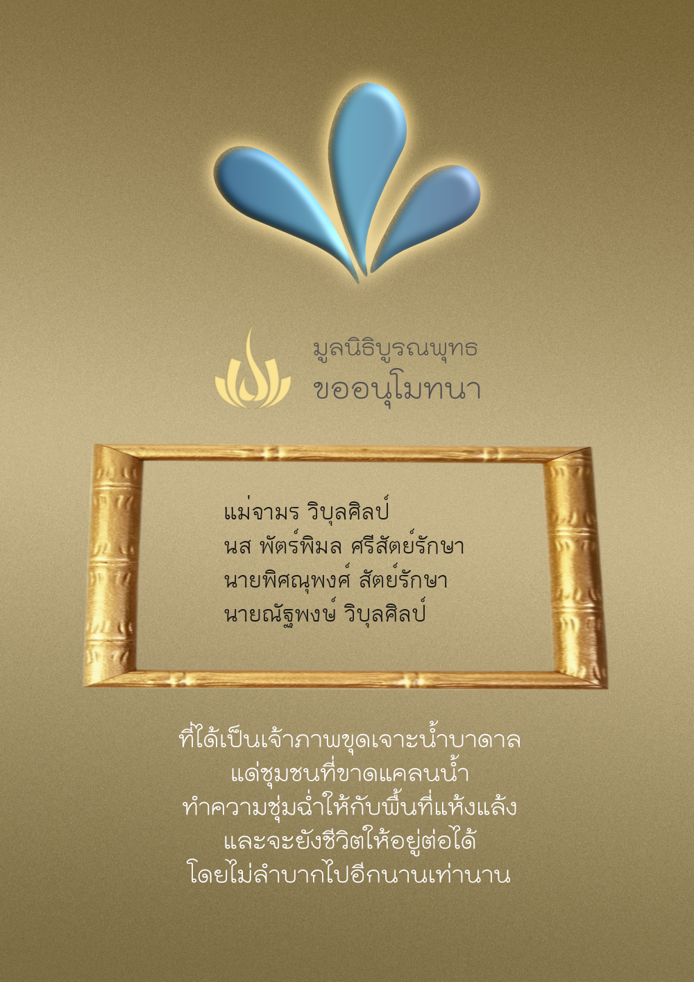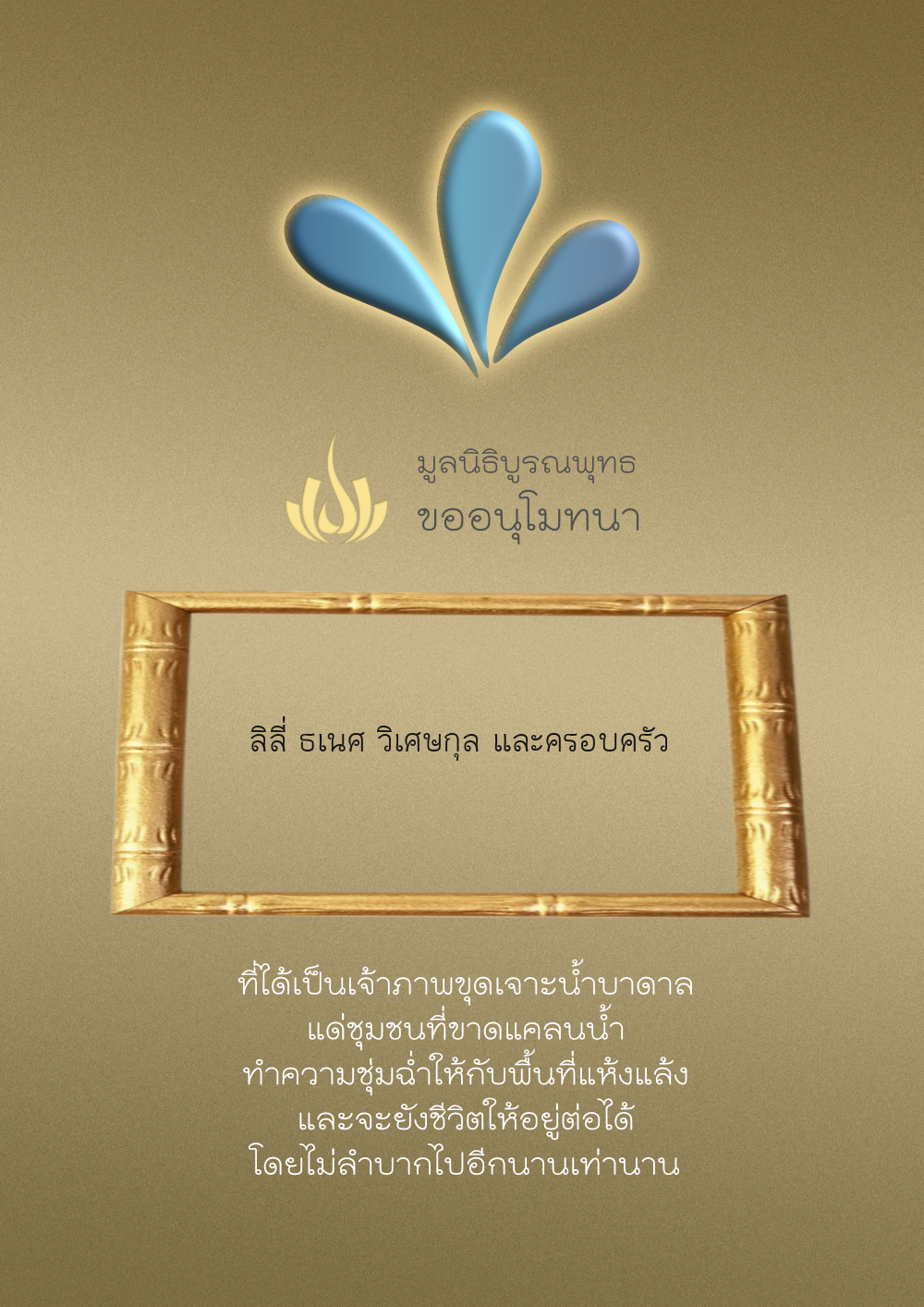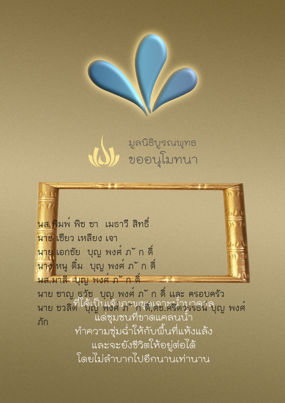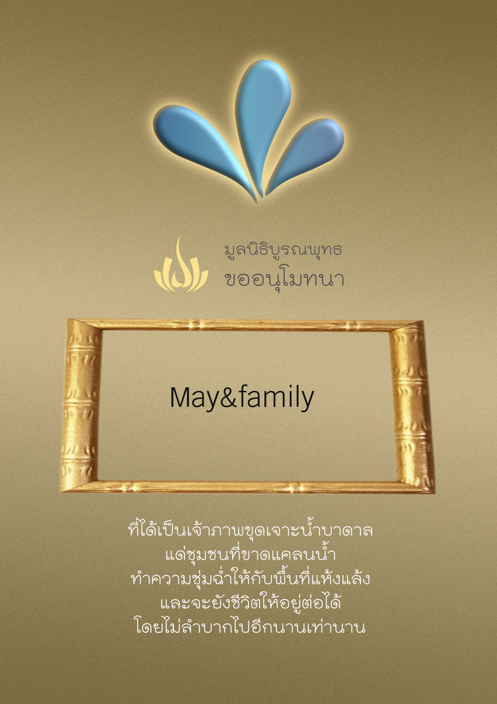 | ลำดับที่ 4326 | มริษฎา แจ่มผล และครอบครัว | 50.00 บาท | ภาพที่ระลึก |