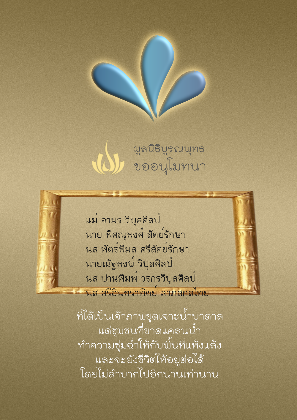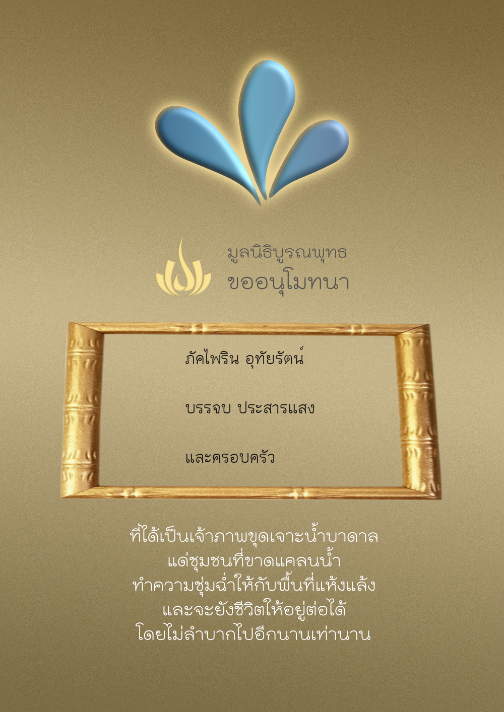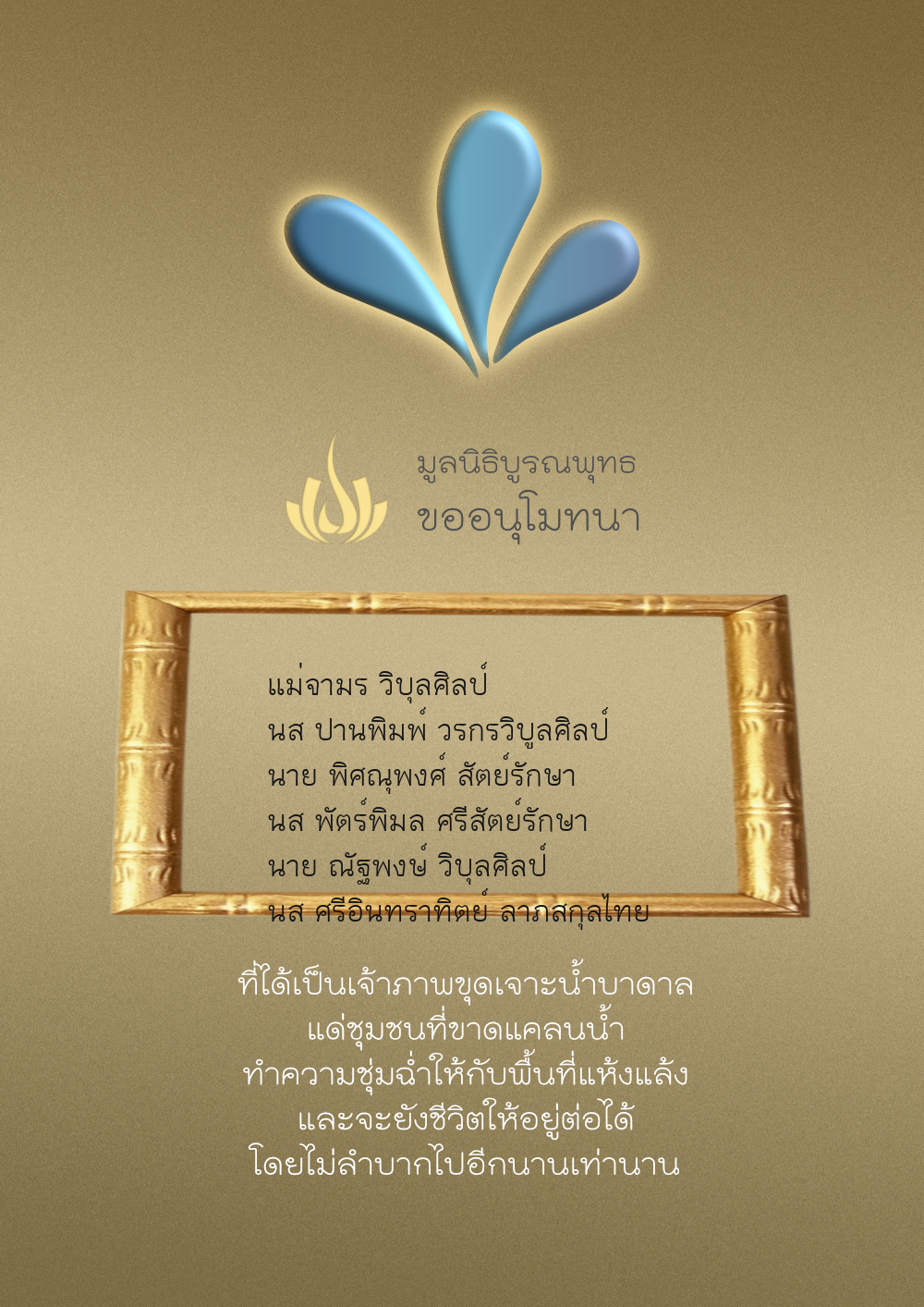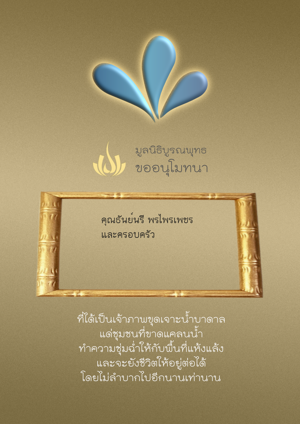 | ลำดับที่ 4326 | มริษฎา แจ่มผล และครอบครัว | 50.00 บาท | ภาพที่ระลึก |