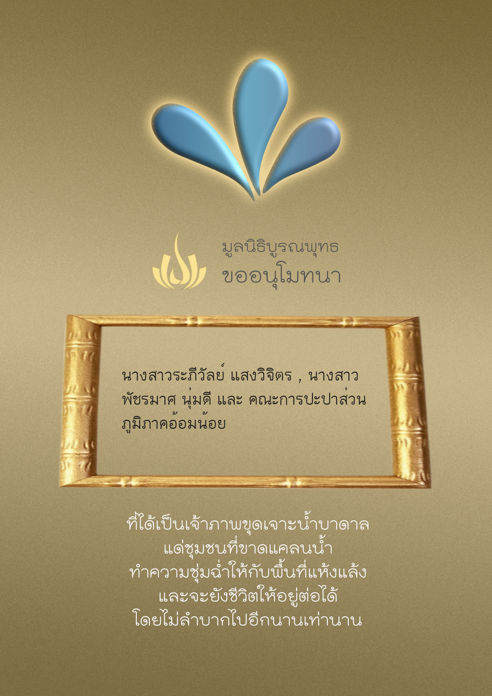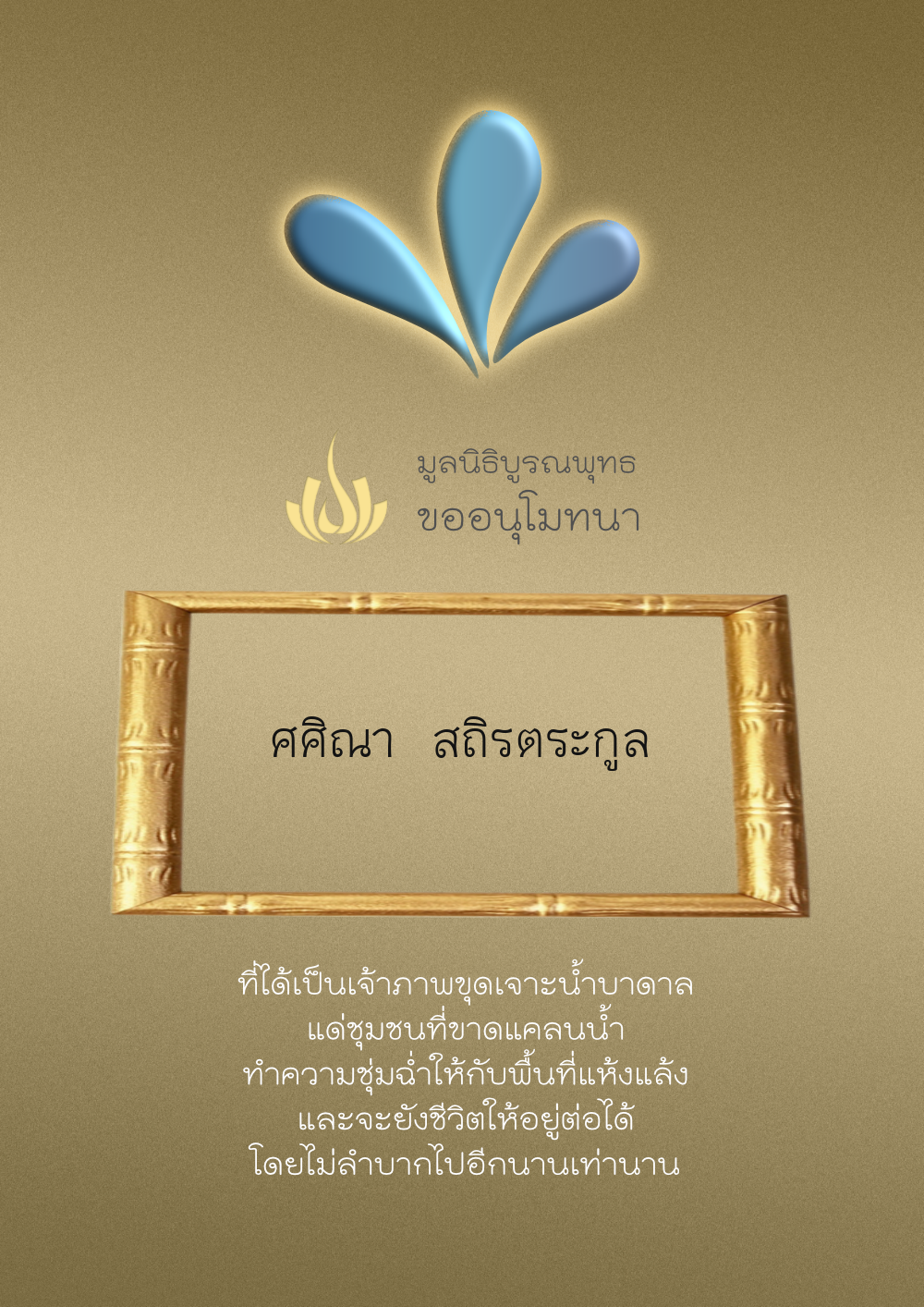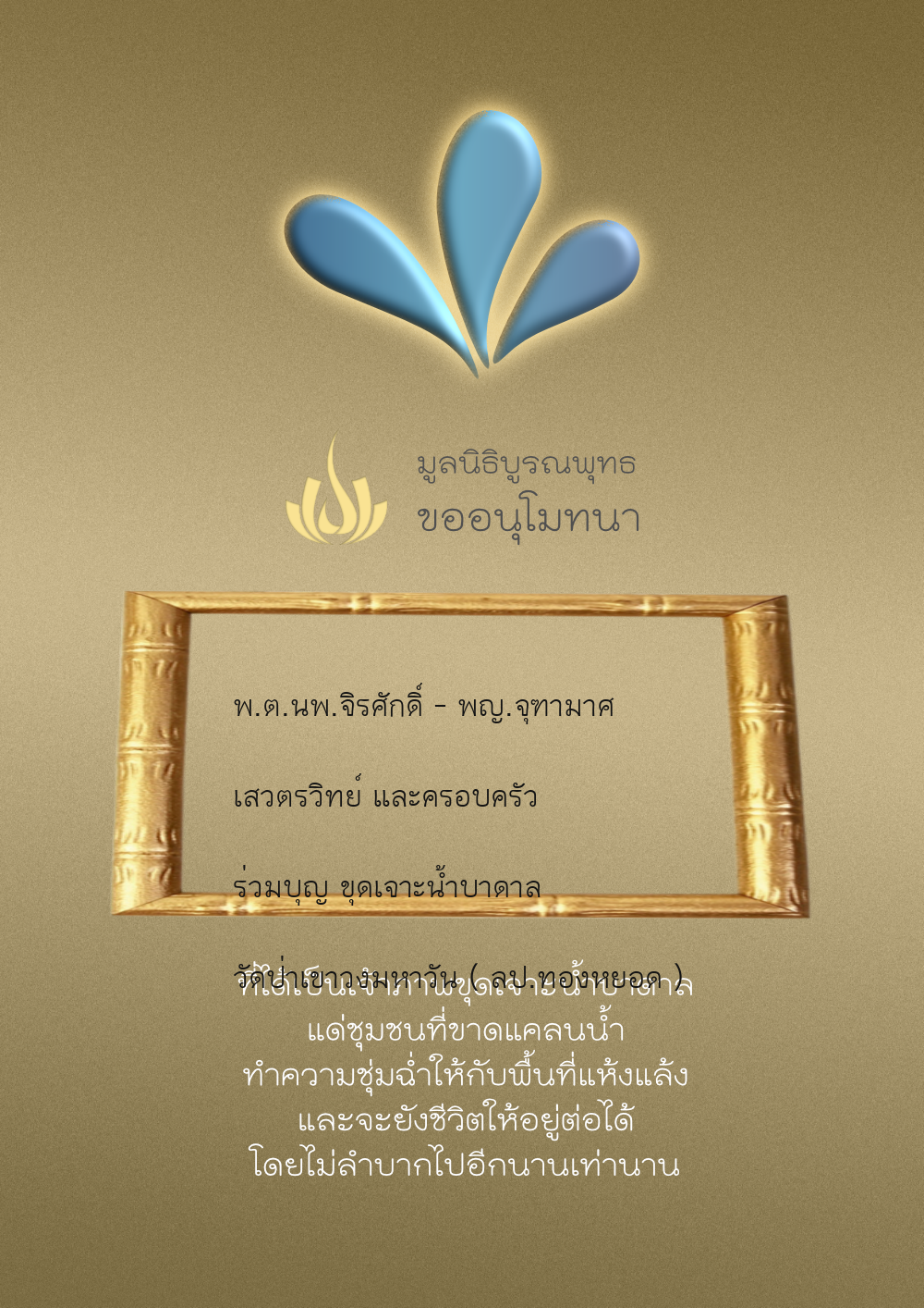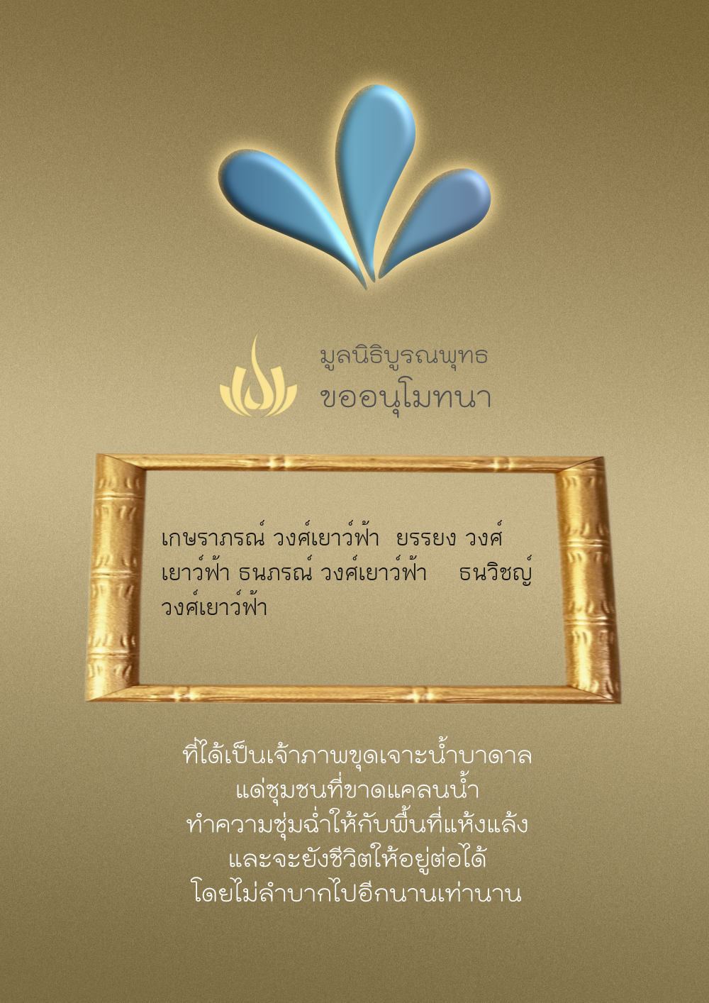 | ลำดับที่ 4326 | มริษฎา แจ่มผล และครอบครัว | 50.00 บาท | ภาพที่ระลึก |