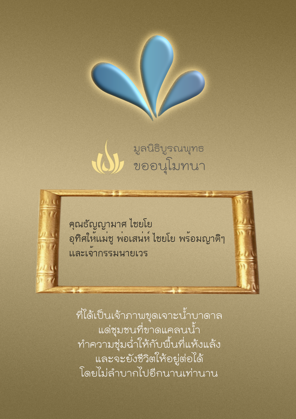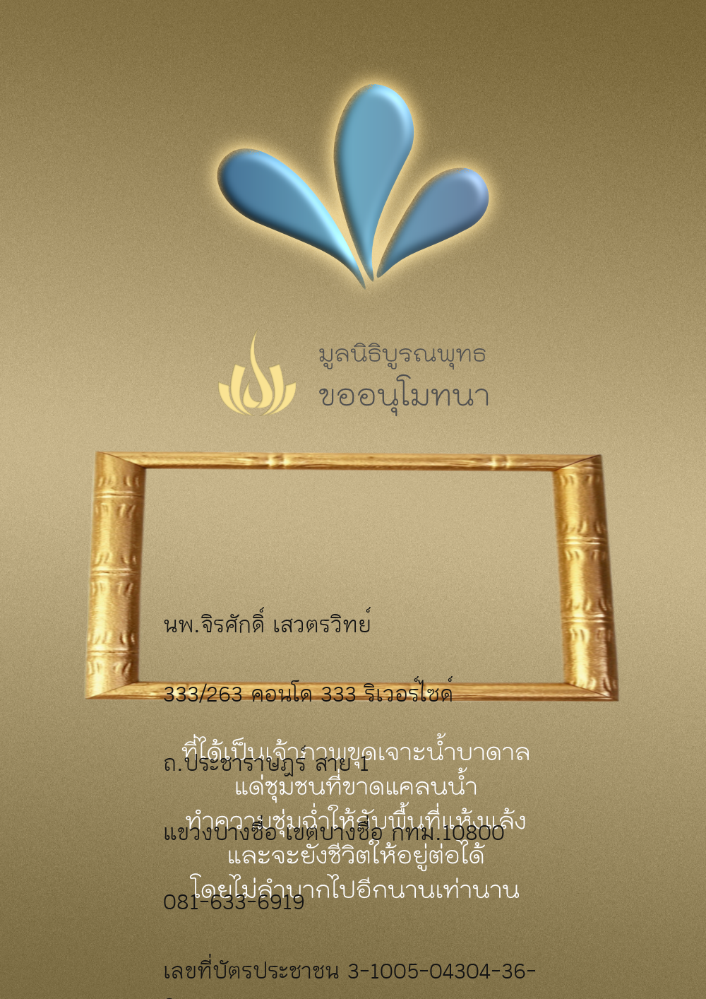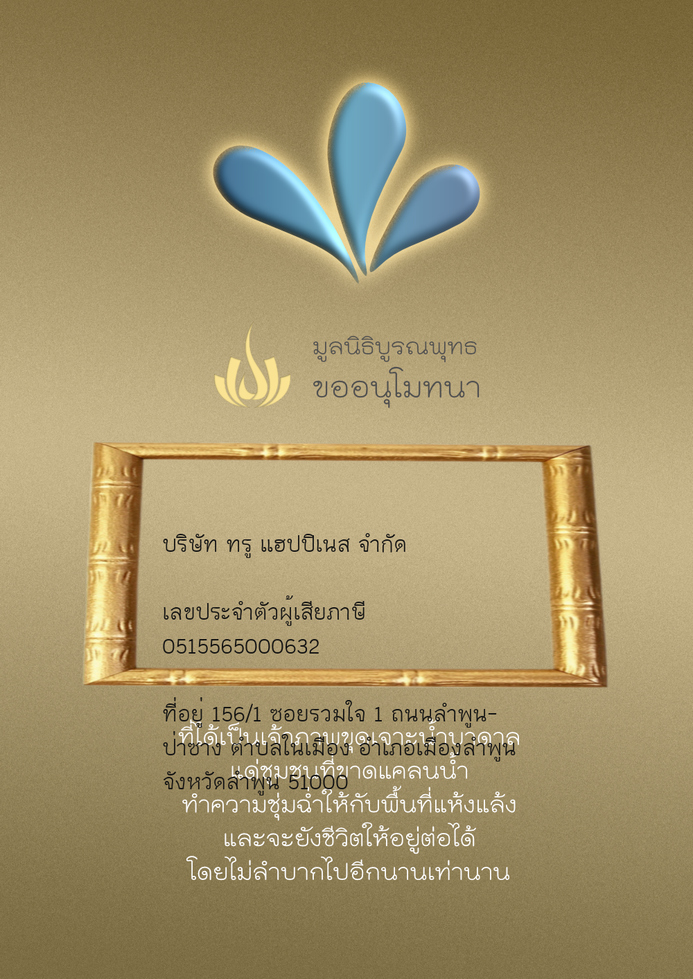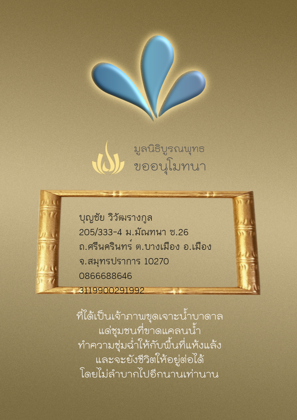 | ลำดับที่ 4326 | มริษฎา แจ่มผล และครอบครัว | 50.00 บาท | ภาพที่ระลึก |