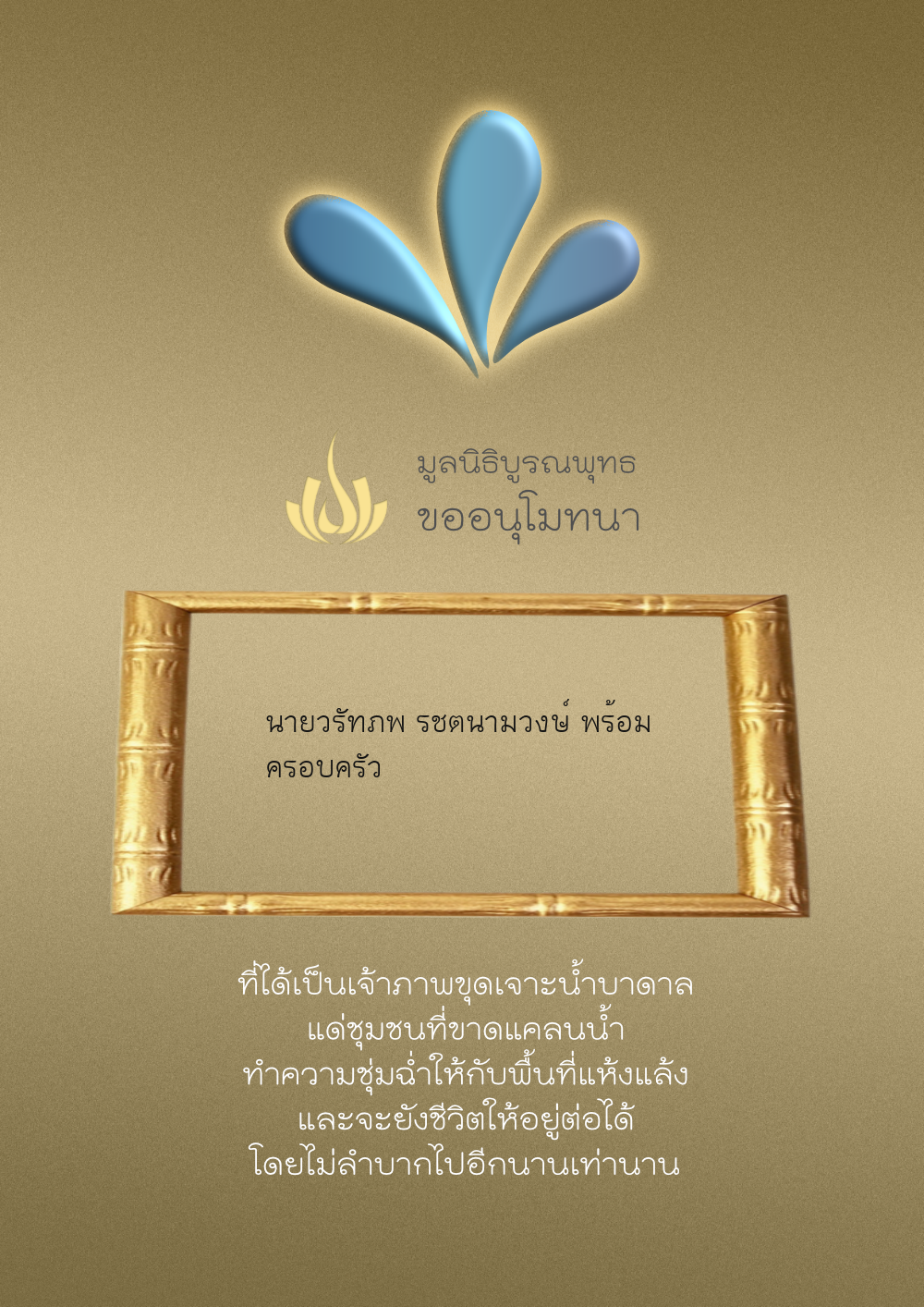 | ลำดับที่ 24 | นาวี ปฐมอนันท์ และครอบครัว | 500.00 บาท | ภาพที่ระลึก |