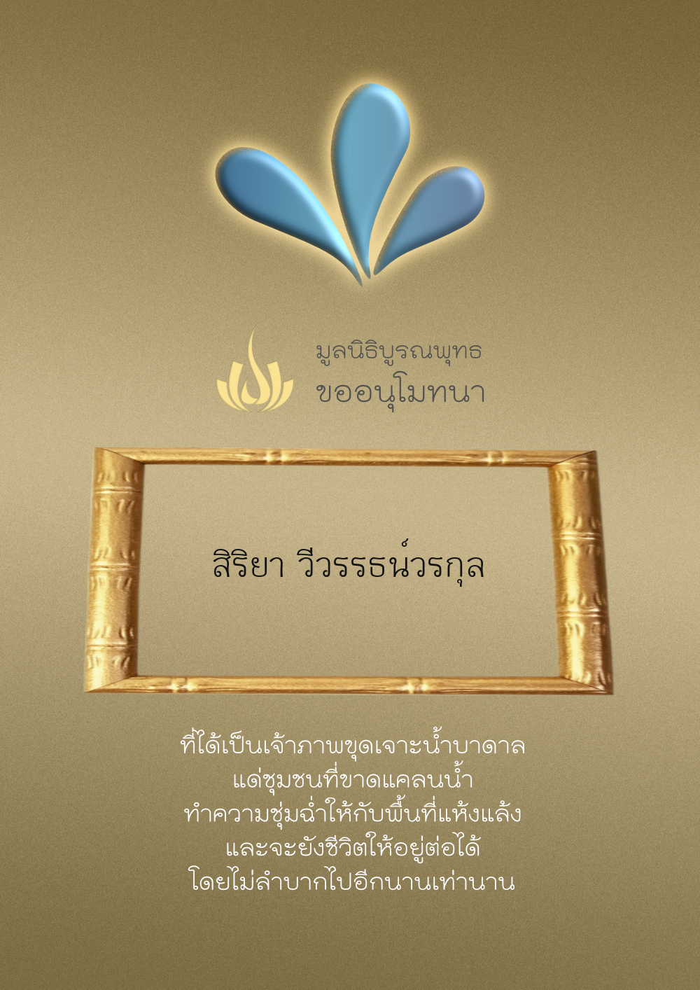| ลำดับที่ 26 | นางสิริพิมล เหลืองวารินกุล | 10,000.03 บาท | ภาพที่ระลึก |